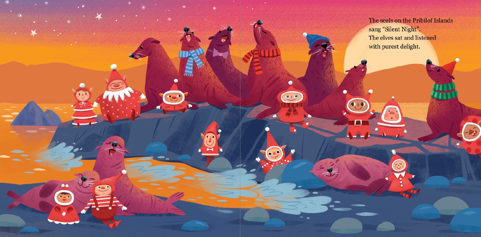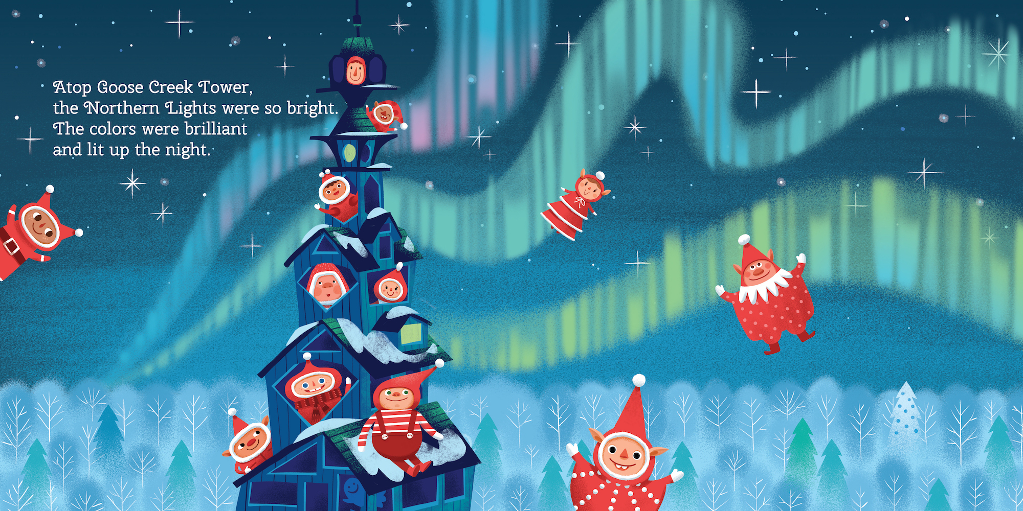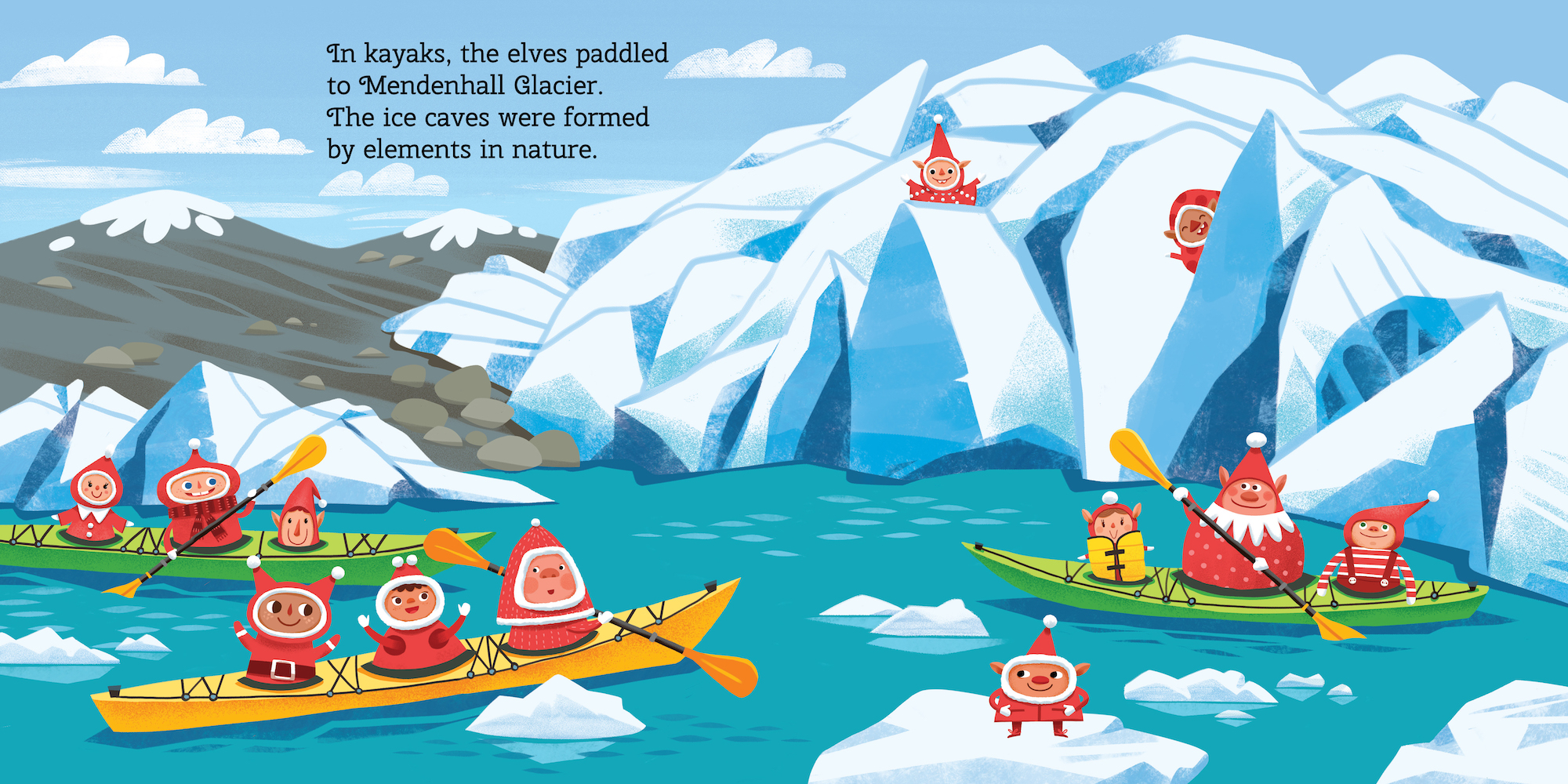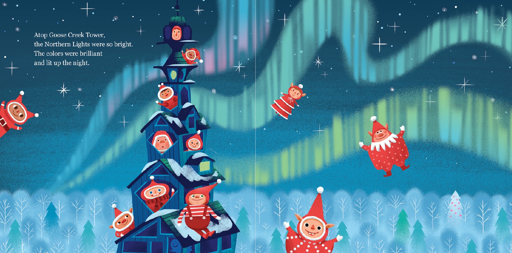 Twelve charming elves travel throughout Alaska to see who is still awake before Santa comes. Along the way, they visit iconic landmarks and curiosities, all bedecked in holly and holiday fun. From Goose Creek Tower to the Pribilof Islands to Mendenhall Glacier and more, these little elves take in the Sitka spruce trees, kayak through the ice, race to the bottom of Mount Denali, and marvel under the Northern Lights. Their last stop? Your home, of course. Jump in bed!