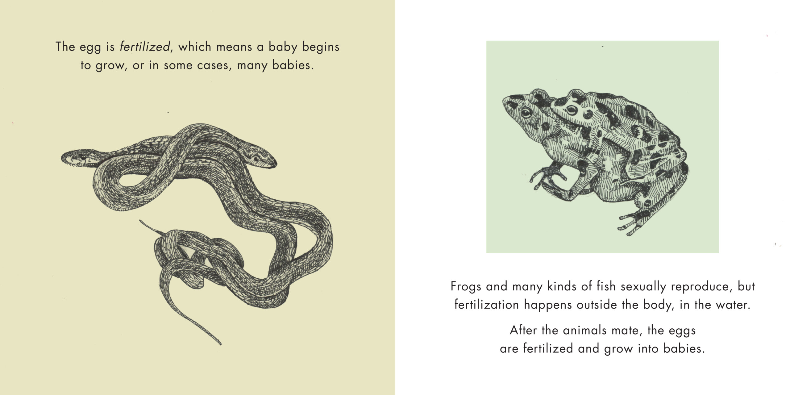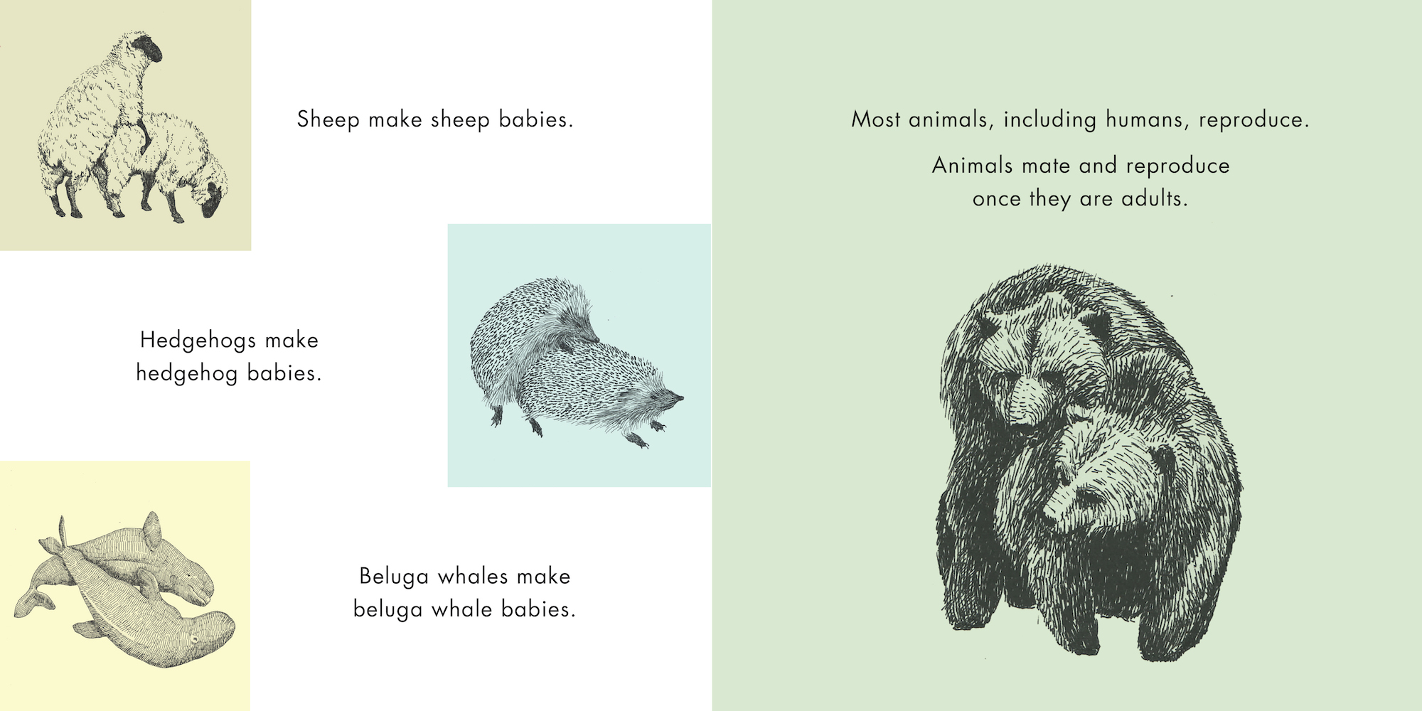 “Where do babies come from?” It’s a question every child asks eventually, and Animals Mate is the simple, straightforward, and developmentally appropriate guide every parent needs to normalize sexual reproduction via adorable animal partners. With a modern design and beautiful illustrations, Animals Mate introduces facts about mating, including tactful discussion of the mechanics of the process, anatomy, and sperm and eggs. Bypass the awkwardness that often accompanies “the talk” about how babies are made and help your child understand sex and reproduction as the natural and wonderful process that results in the world’s greatest treasure: babies!