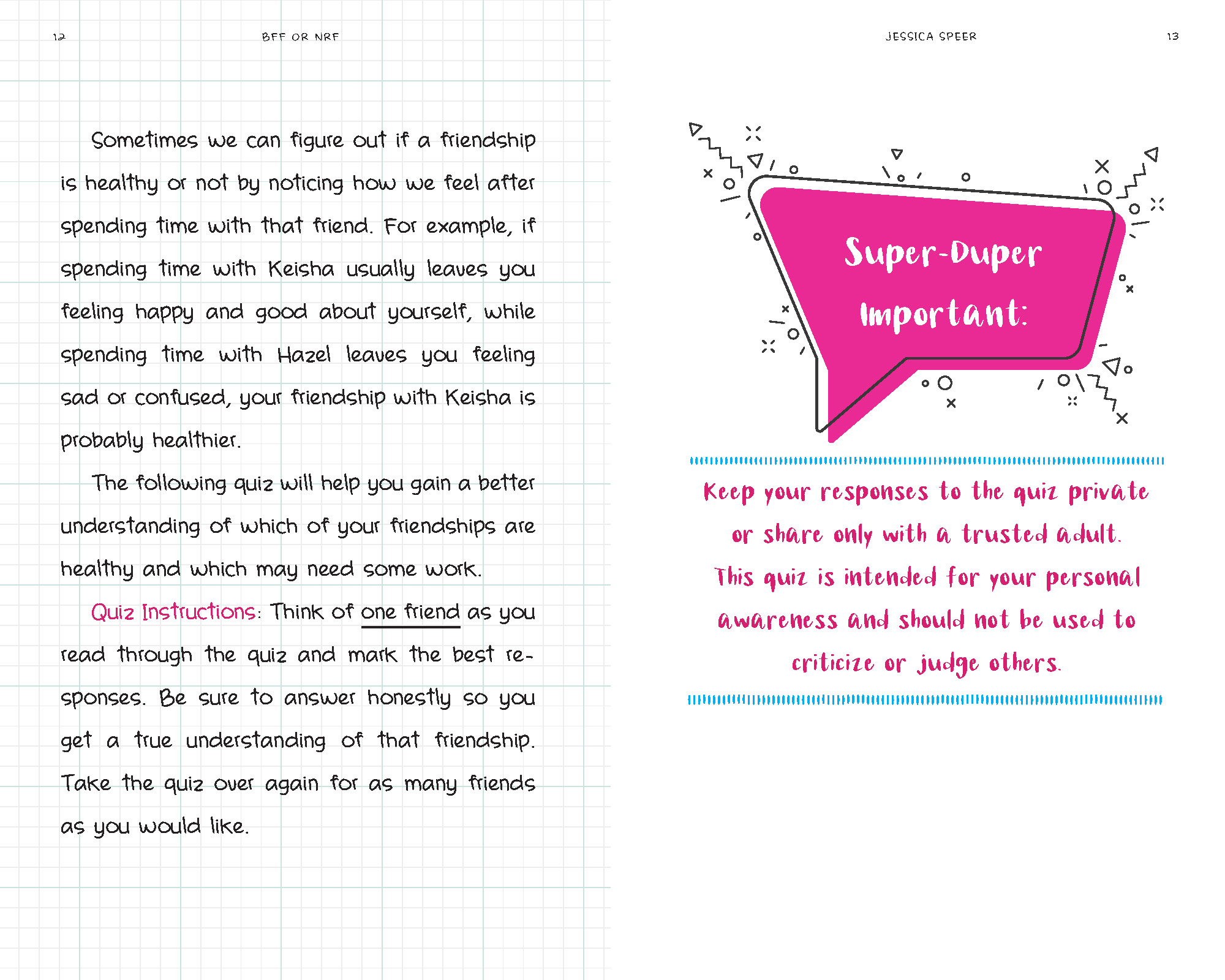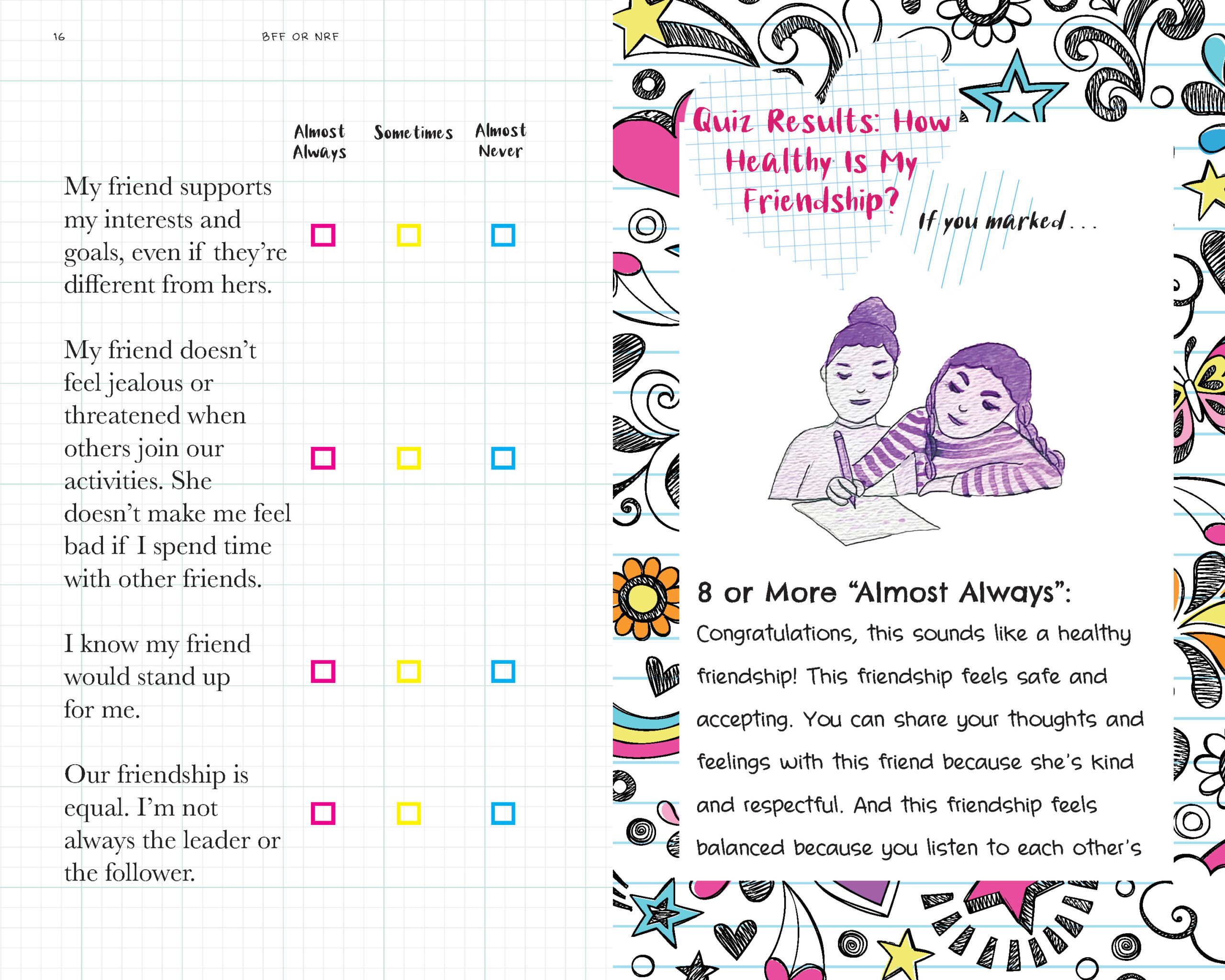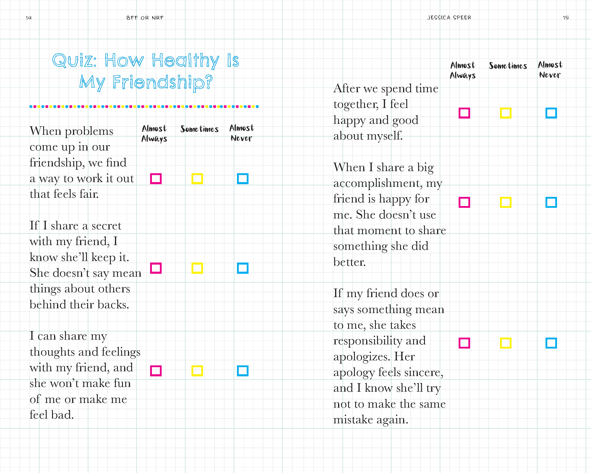 Packed with fun quizzes, colorful illustrations, and stories about girls just like you, BFF or NRF (Not Really Friends) is the ultimate interactive guidebook to help you learn the ins and outs of friendship.