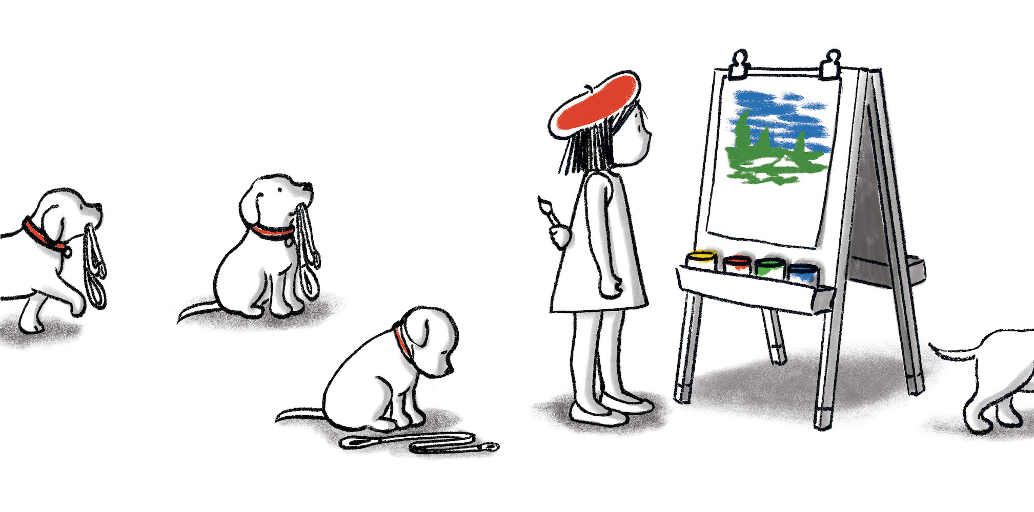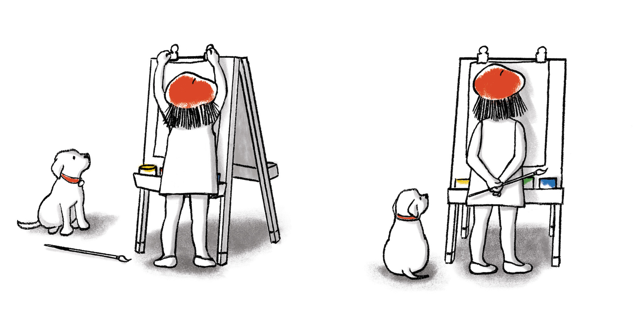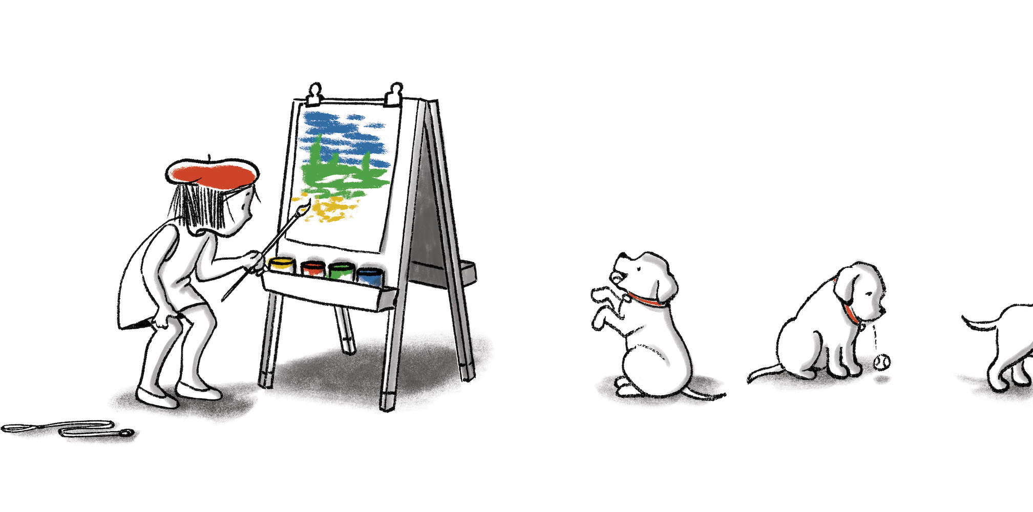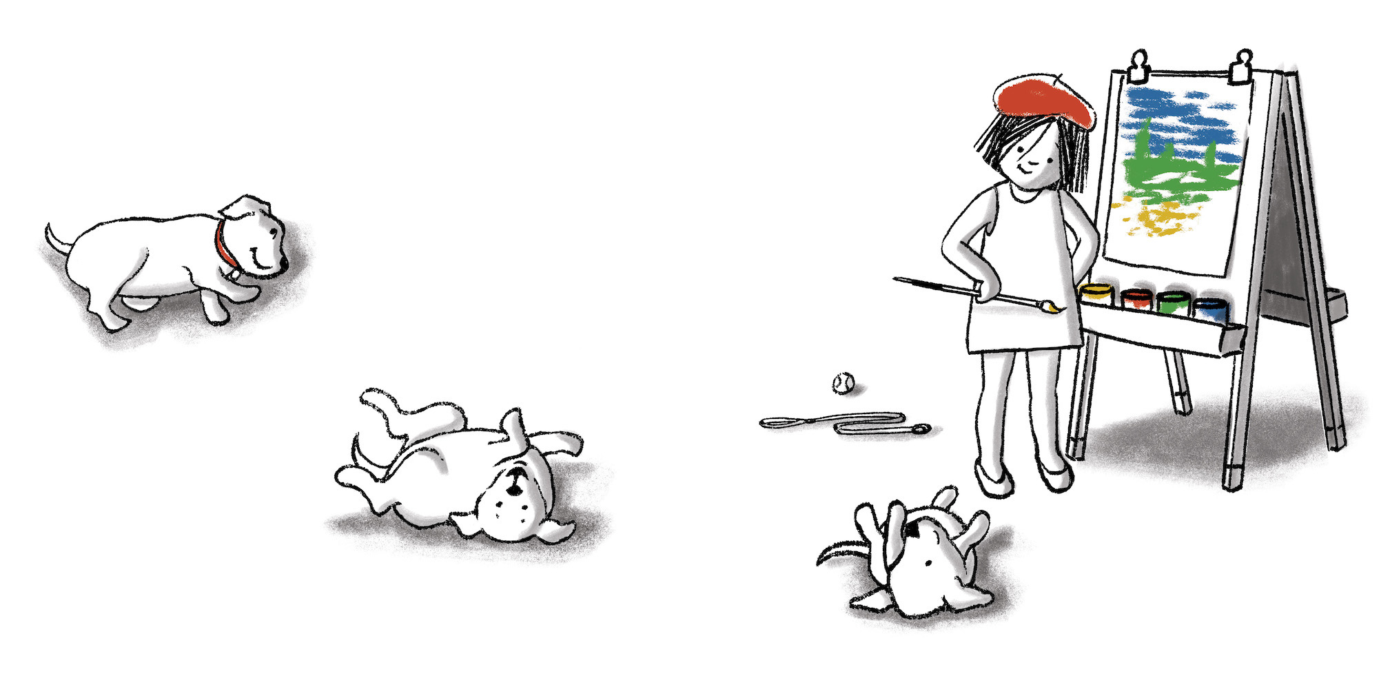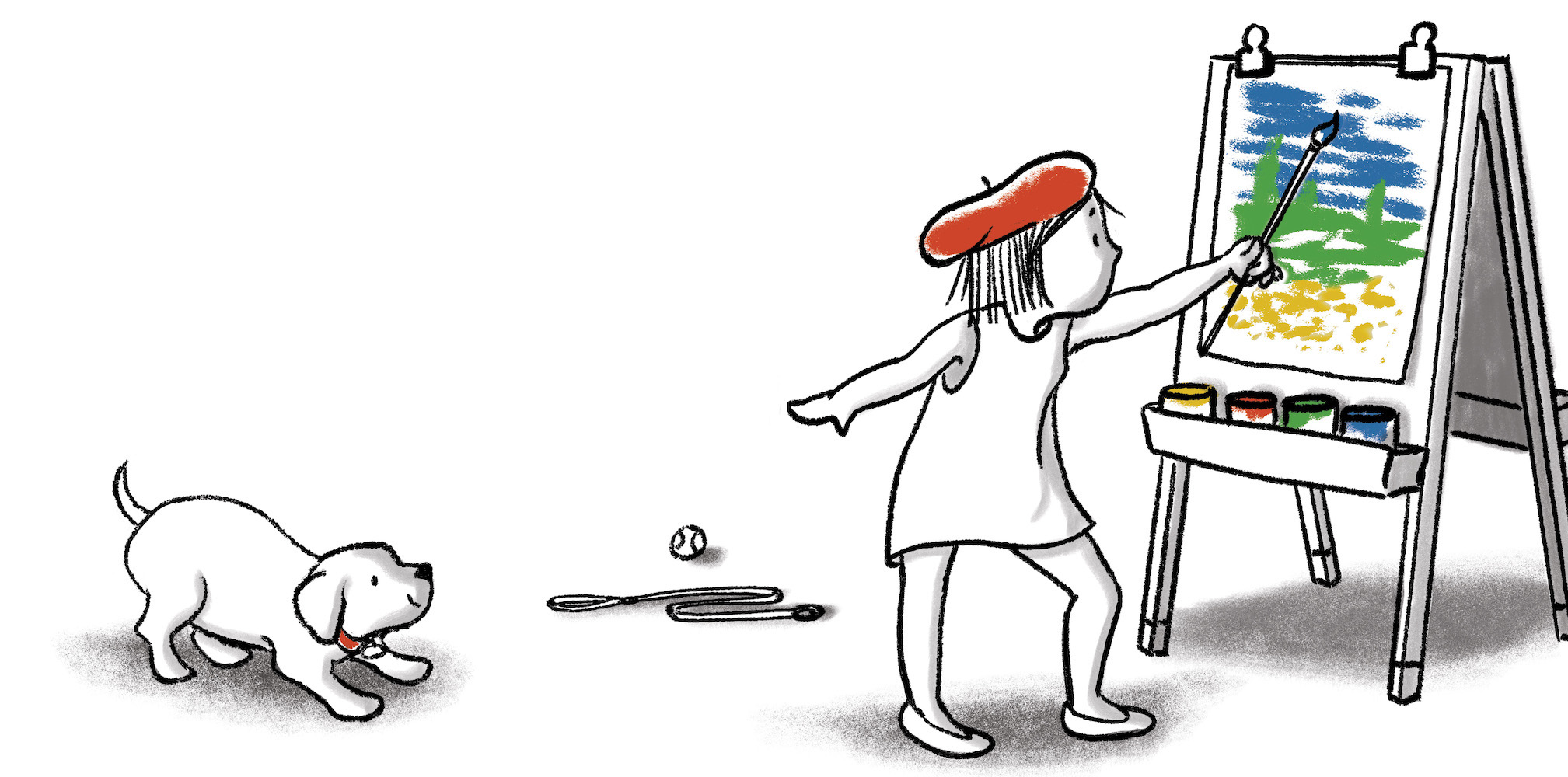 Inspired by a beautiful Claude Monet painting, a little artist decides to create her own masterpiece, but her puppy has other ideas. From grabbing his favorite ball to rolling on the floor, he tries everything to get her attention, and chaos ensues, creating a big, colorful mess.