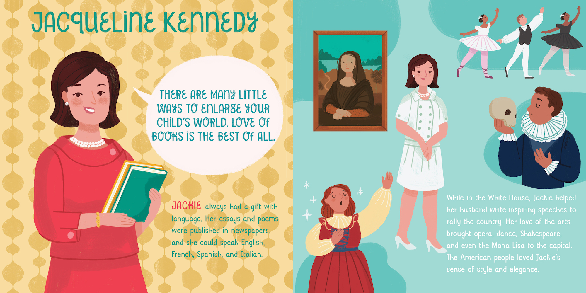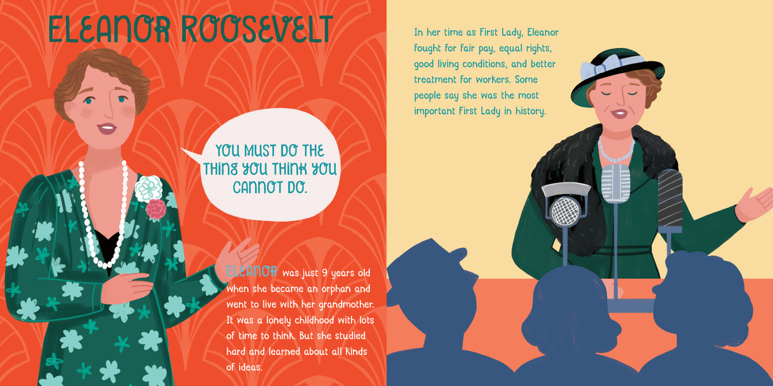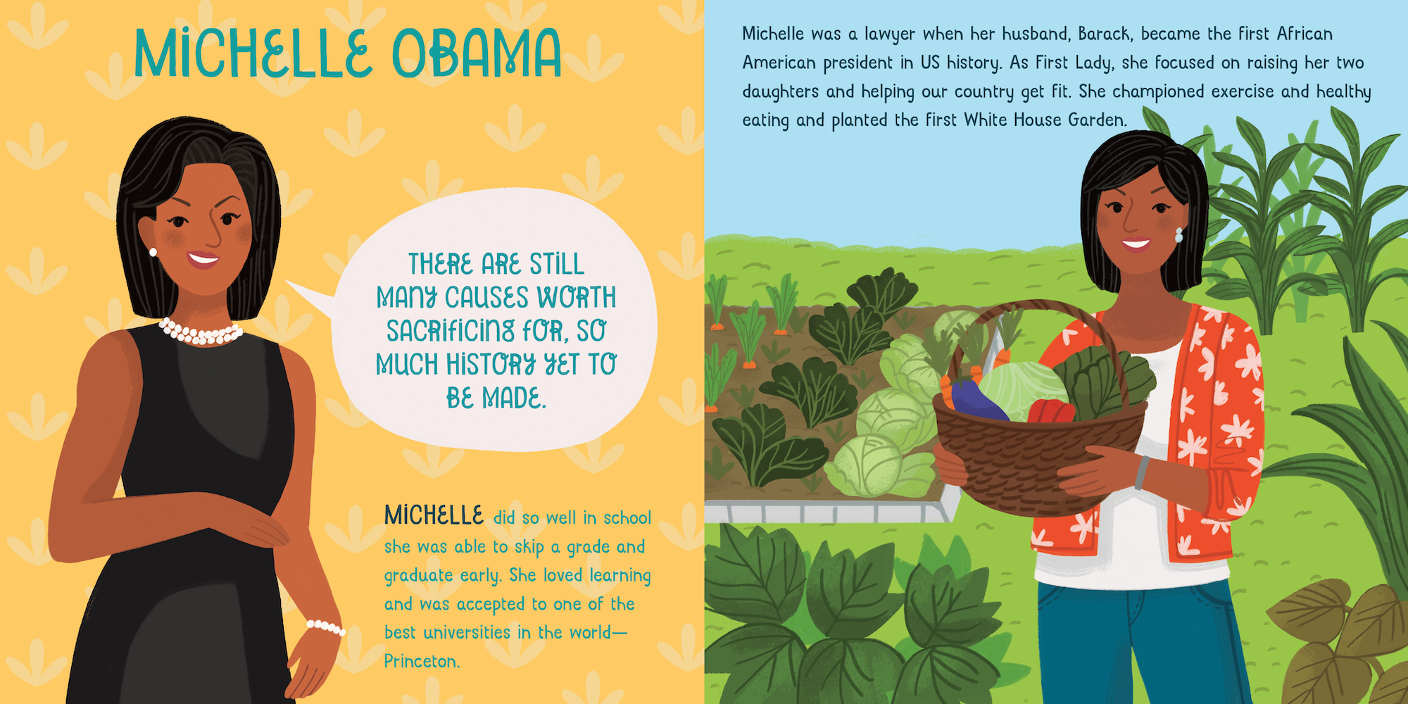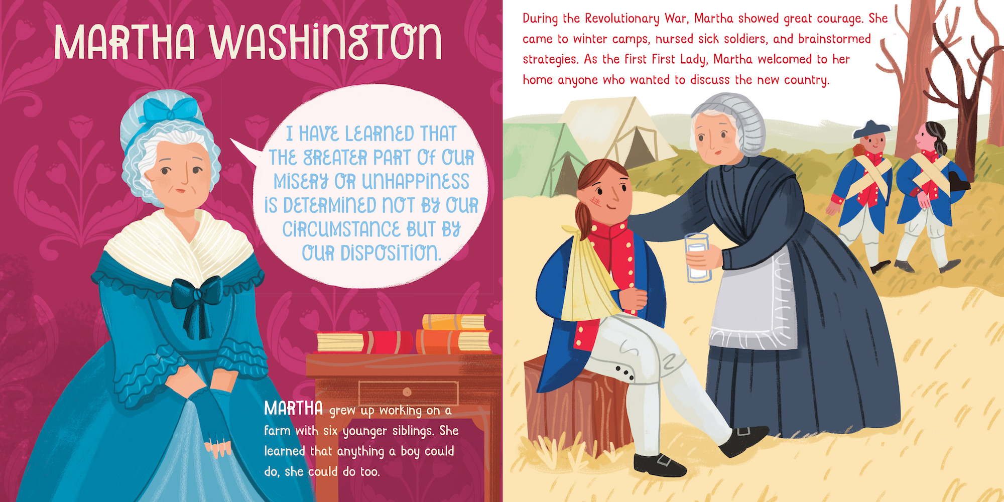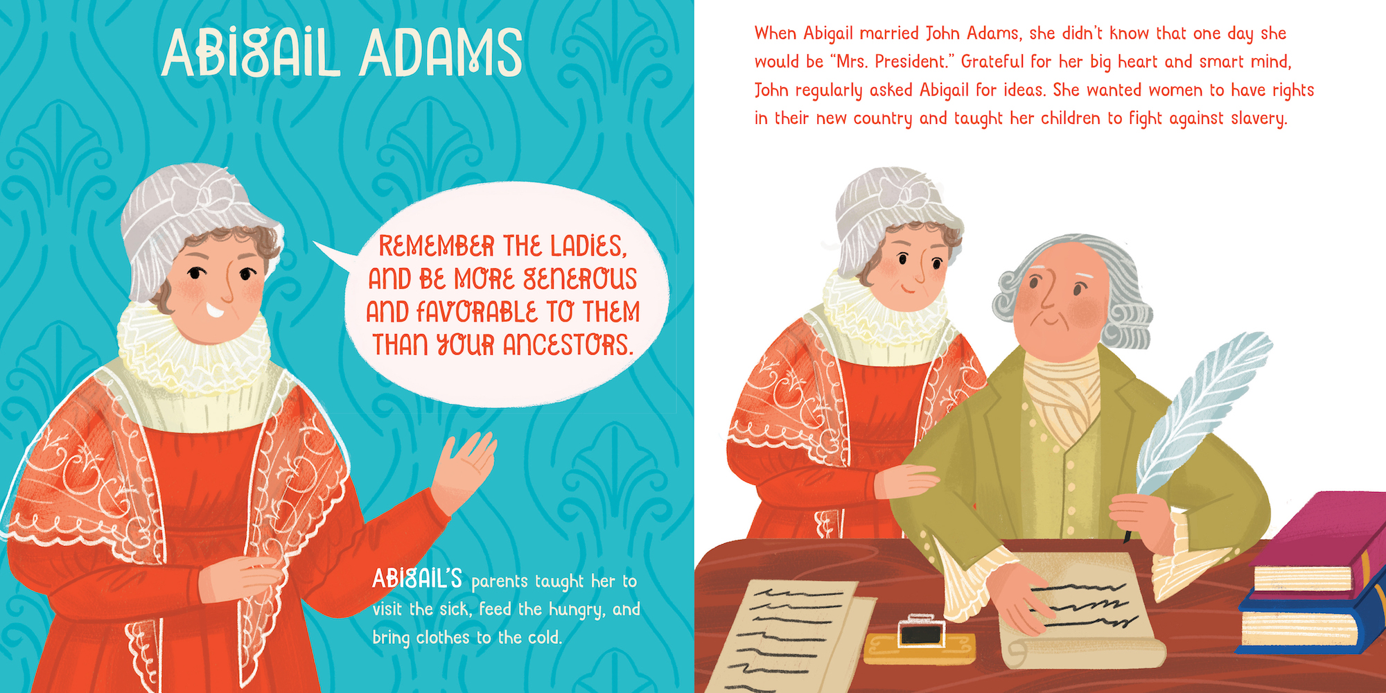 From the steadfast valor of Martha Washington to the ingenious counsel of Michelle Obama, Courageous First Ladies Who Changed the World is a young child’s first introduction to the extraordinary women who used their time in the White House to change the world. Simple text and adorable illustrations tell the contributions of eleven presidential women: Martha Washington, Abigail Adams, Dolley Madison, Eleanor Roosevelt, Jacqueline Kennedy, Betty Ford, Lady Bird Johnson, Laura and Barbara Bush, Hilary Clinton, and Michelle Obama. A quote from each First Lady is included on each spread along with colorful, delightful artwork.
