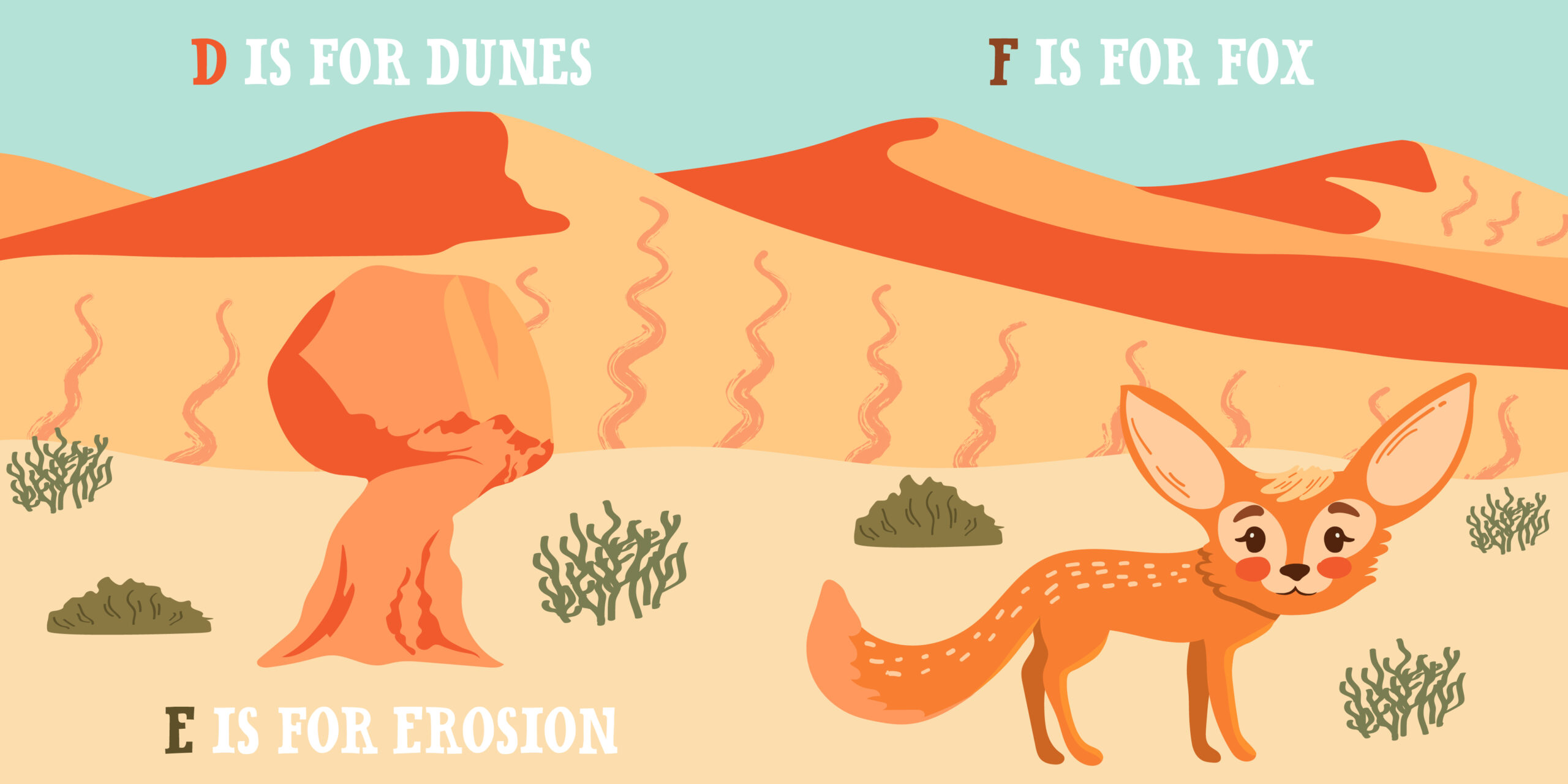 With E for erosion, I for iguana, and P for prickly pear, going from A to Z has never been more fun in the sun! Take an alphabetized trip through the dunes and discover the plants, animals, and weather patterns that make the deserts of the world so amazing!