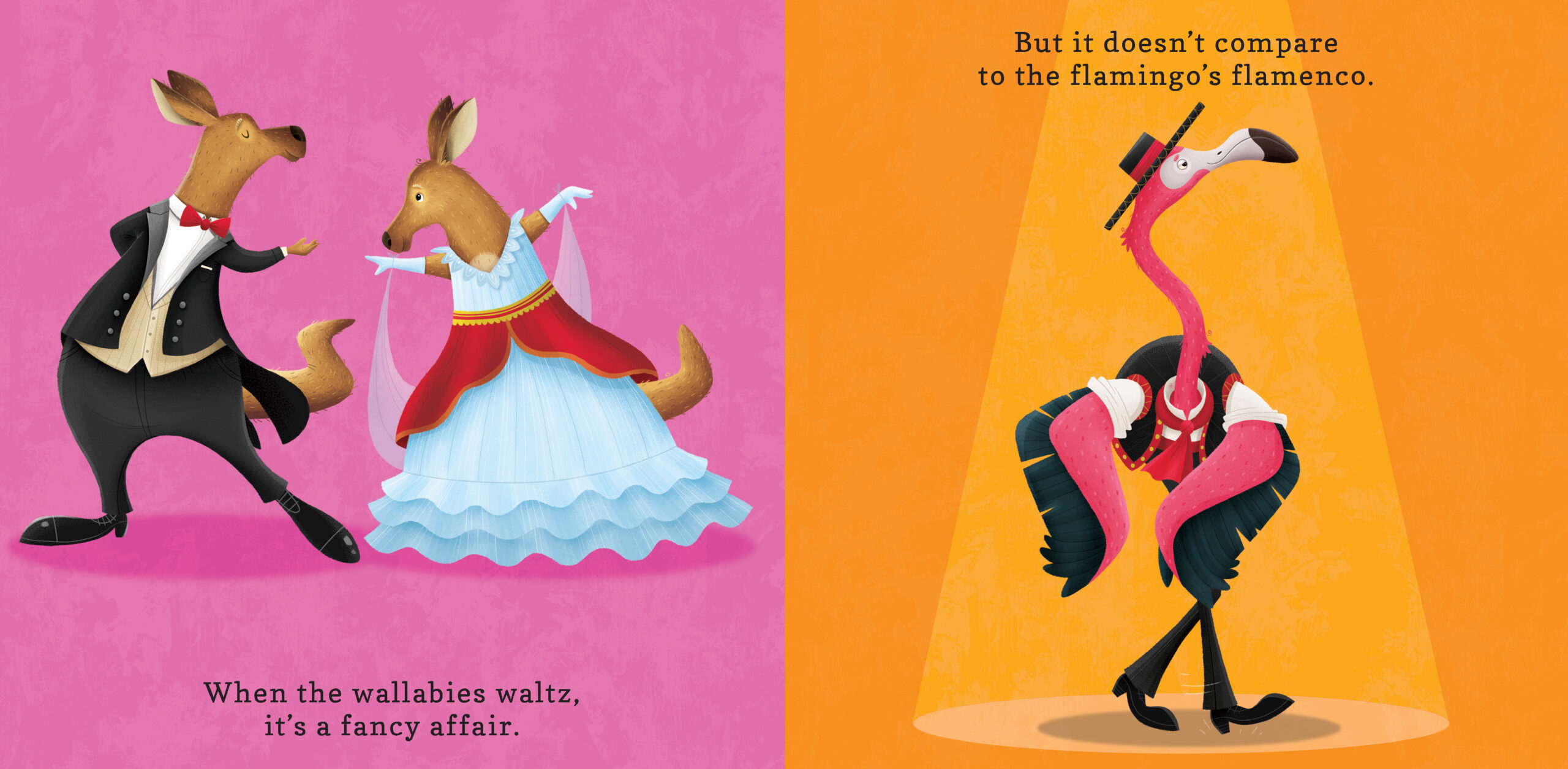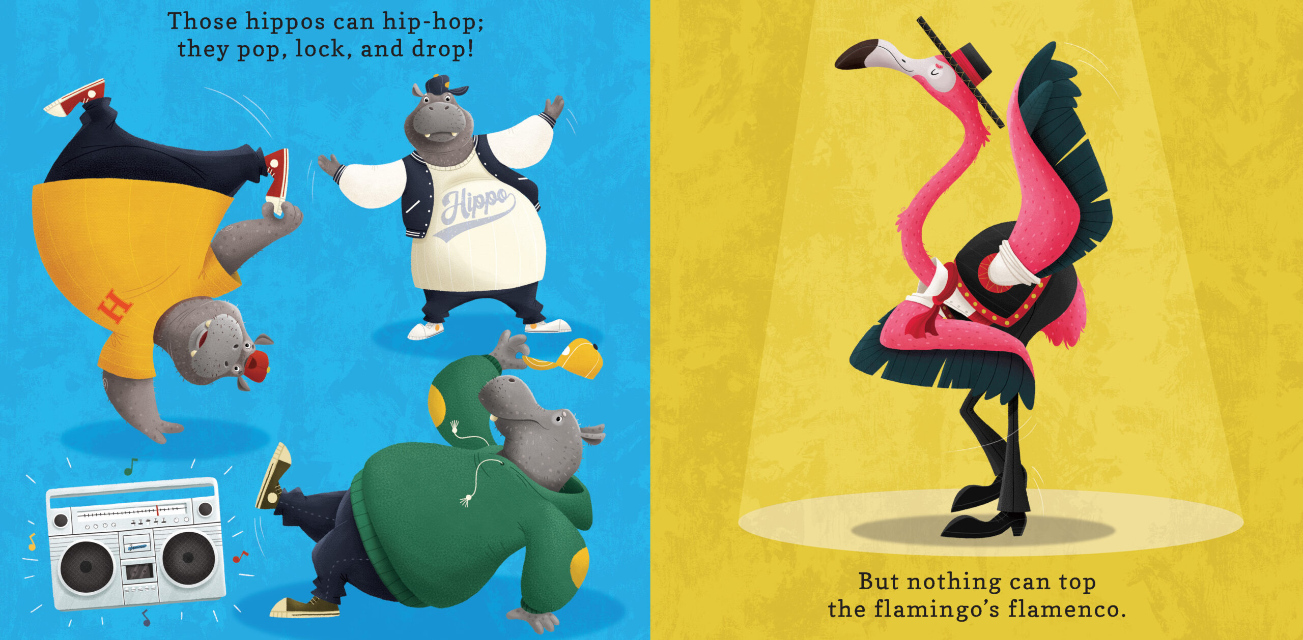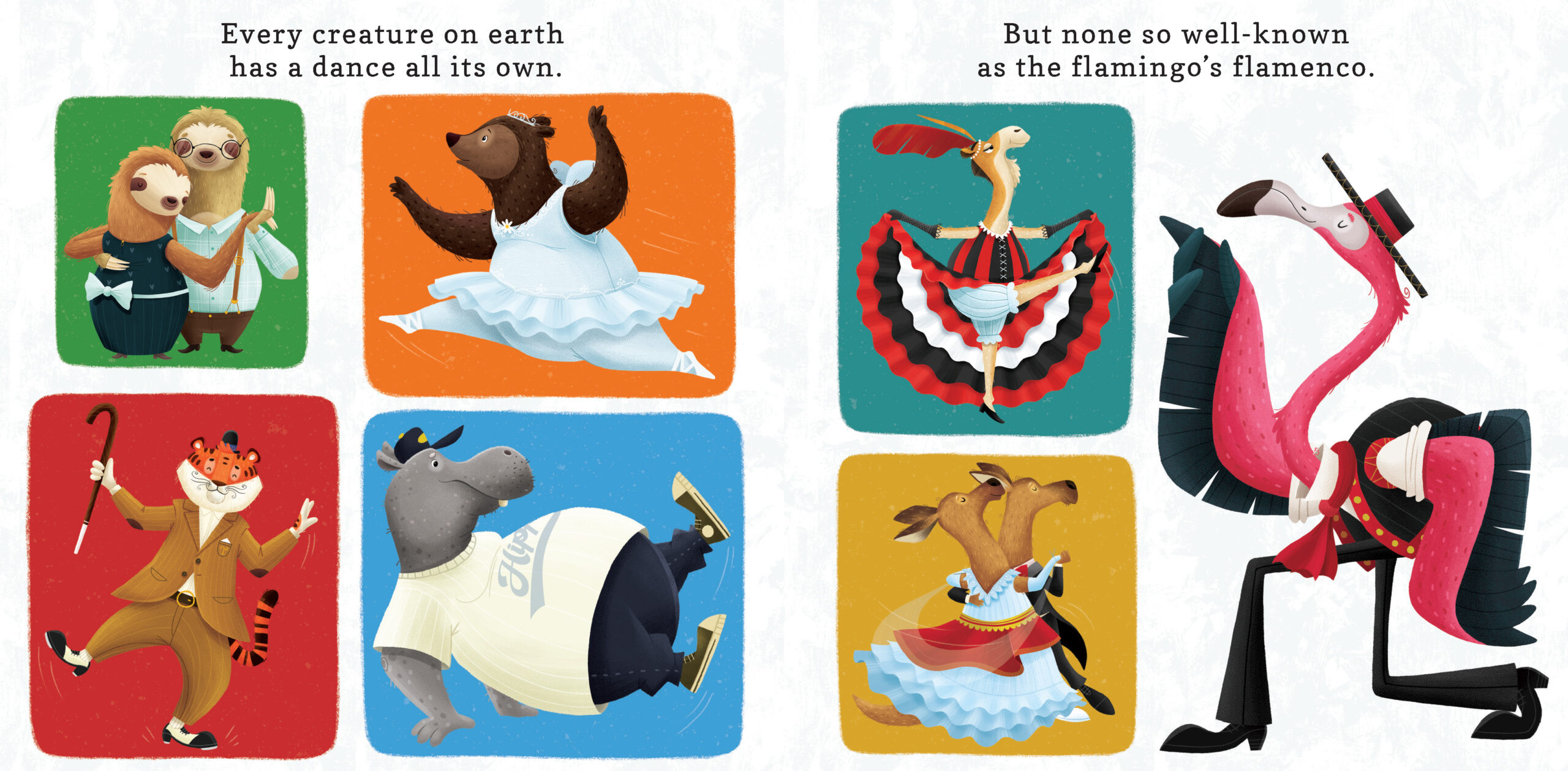 A flamenco-dancing flamingo struts and swaggers, certain that he is the best dancer in the animal kingdom. From hip hopping hippos to tap dancing tigers, each animal finds its own jungle boogie, and Flamingo soon discovers that no two dancers are the same—and that's okay! A fantastic book for any child who loves dancing or animals, Flamingo Flamenco and its rhythmic text and boldly colored animals will get your little dancers wriggling and jiggling.