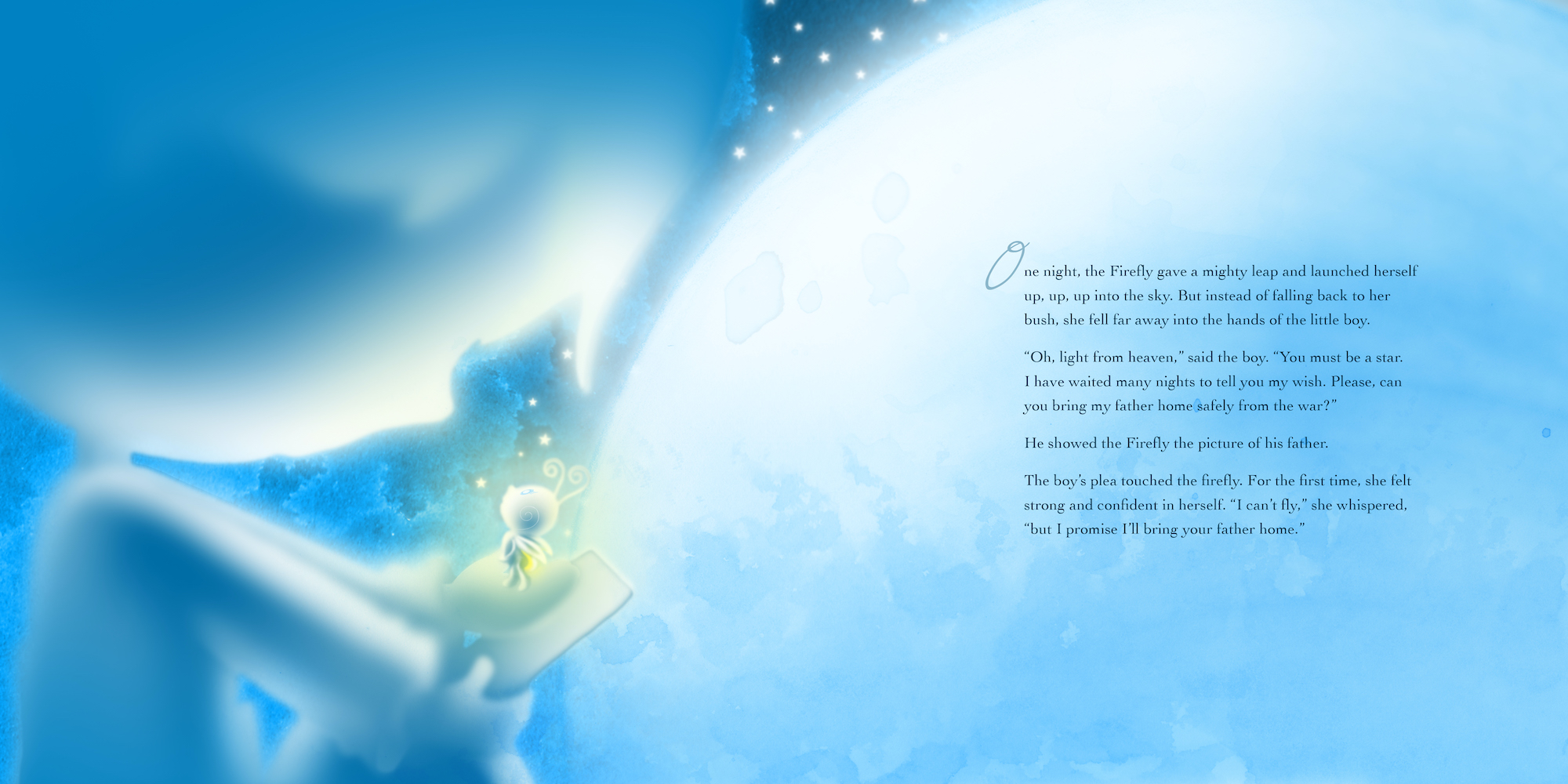 When a young boy’s father doesn’t return from the war, the lonely boy wishes upon a shooting star—one that turns out to be a little firefly who, try as she might, just can’t fly. Touched by the boy’s earnest wish, the firefly undertakes a courageous journey to bring the boy’s father home. Hope, love, and the courage of an unlikely hero fill the pages of this stunningly illustrated picture book.