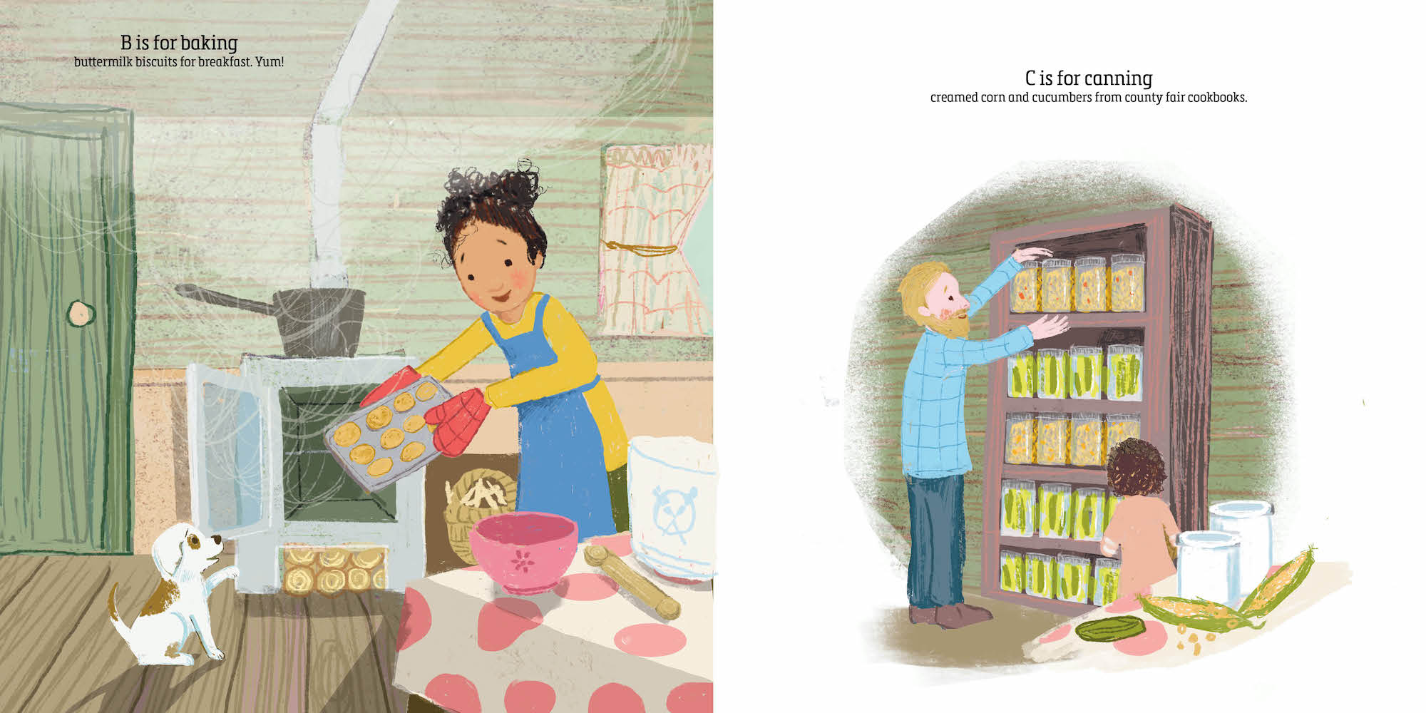 A is for attic and armfuls of aprons our aunties once made. B is for baking the batter for buttermilk biscuits. Yum!