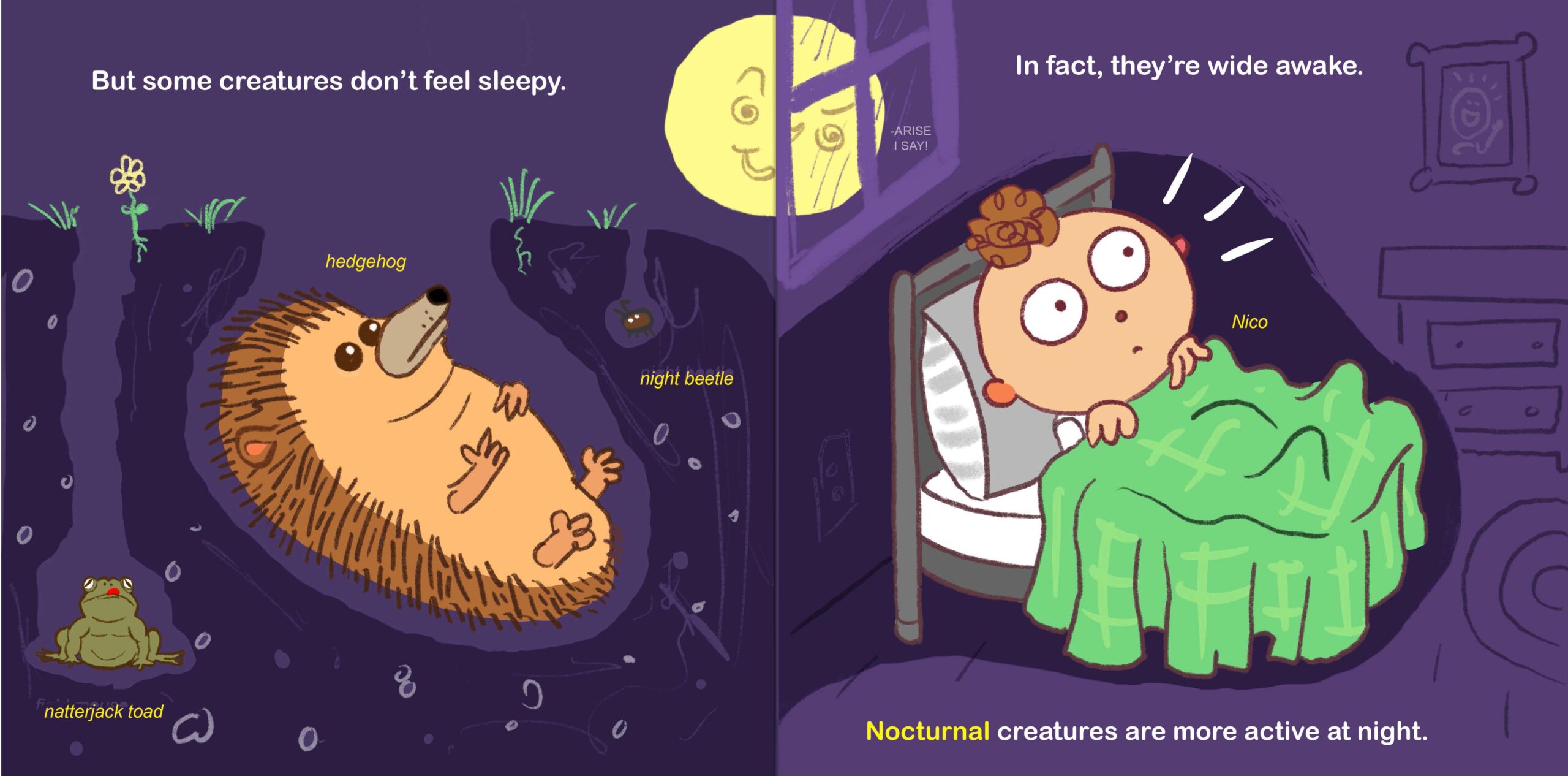 Includes one page of backmatter explaining the difference between nocturnal and diurnal animals and the adaptations that allow them to thrive at night.