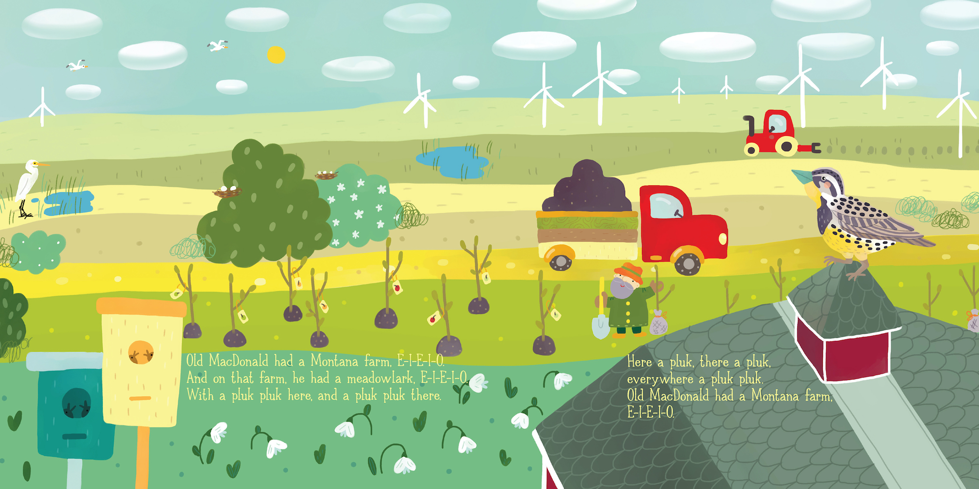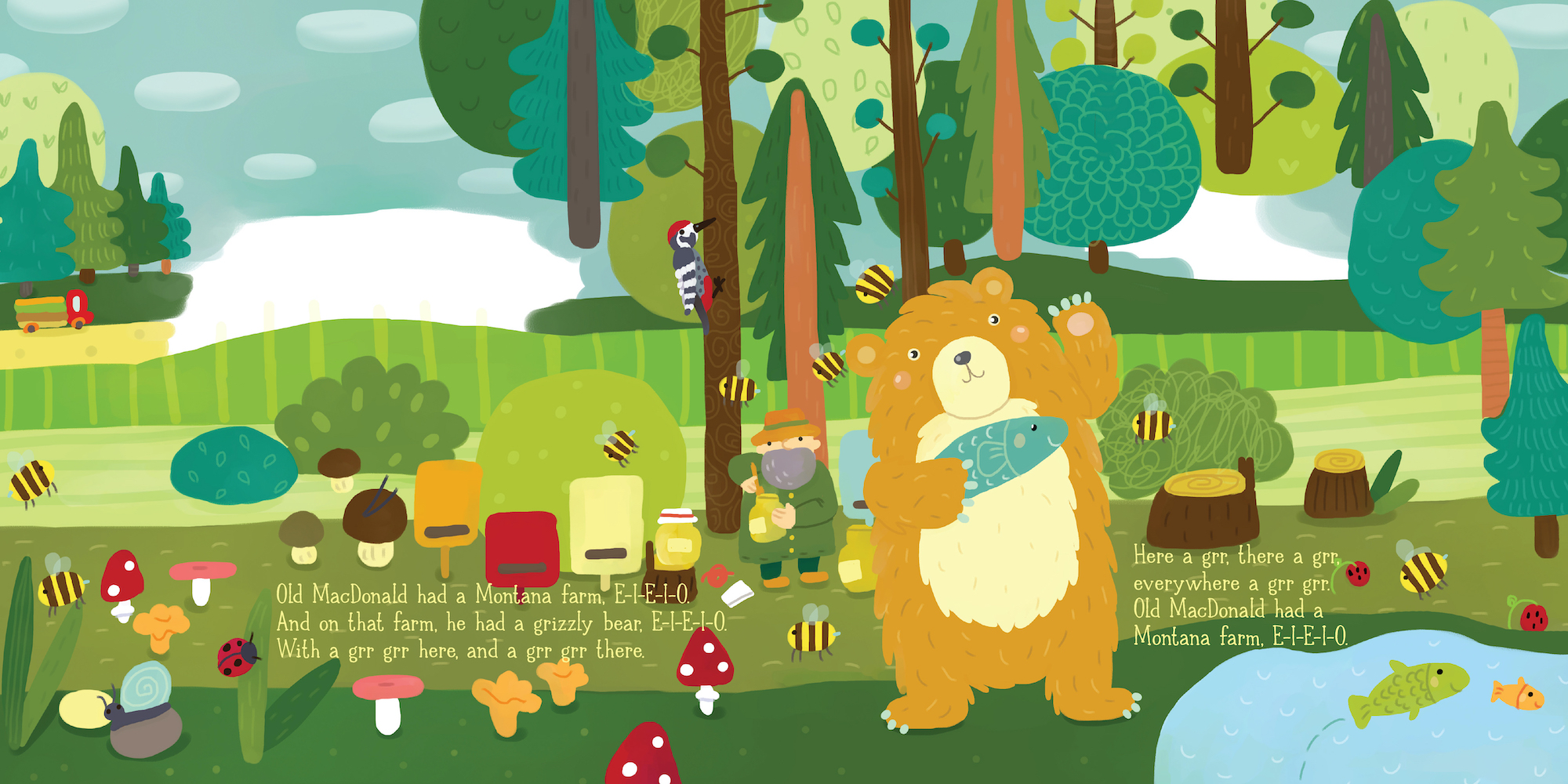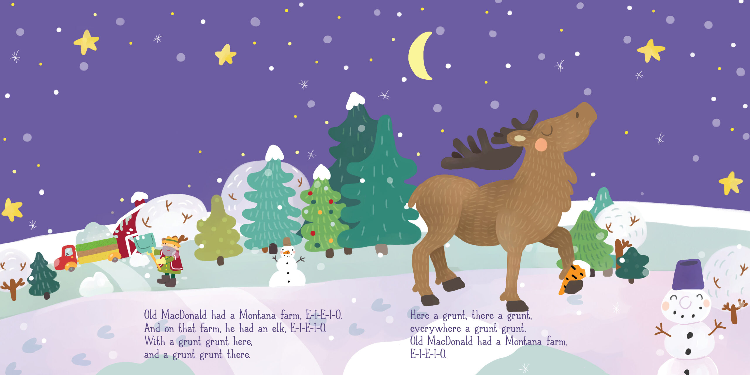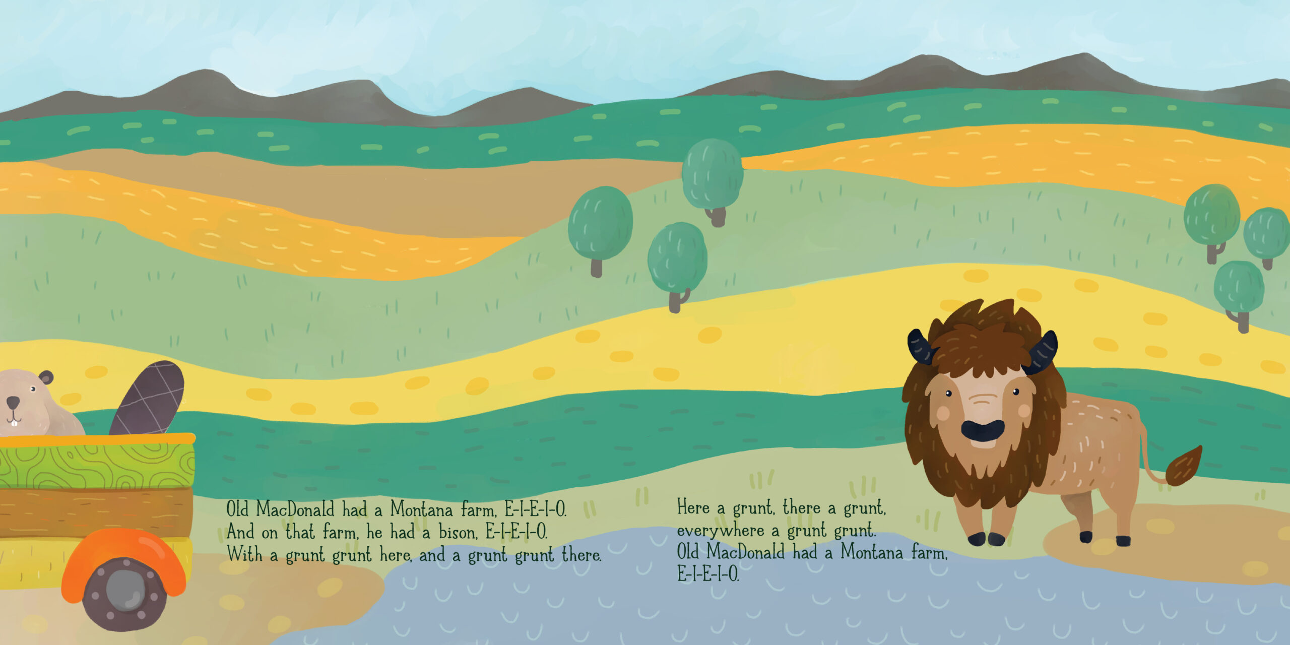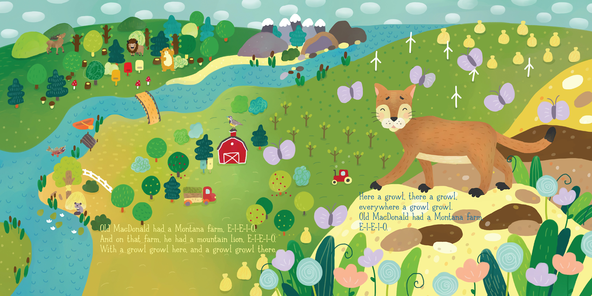 Old MacDonald had a farm . . . in Montana! In this delightful Montana twist on the familiar farm tune, the elk goes grunt grunt here, the gray wolf goes Ooooooo there, and everywhere there’s lots of Montana pride! This chunky layered board book cleverly reveals each Montana animal and, when closed, forms an adorable pickup truck! Friendly Montana animals and scenery fill the pages of this irresistible book for kids.