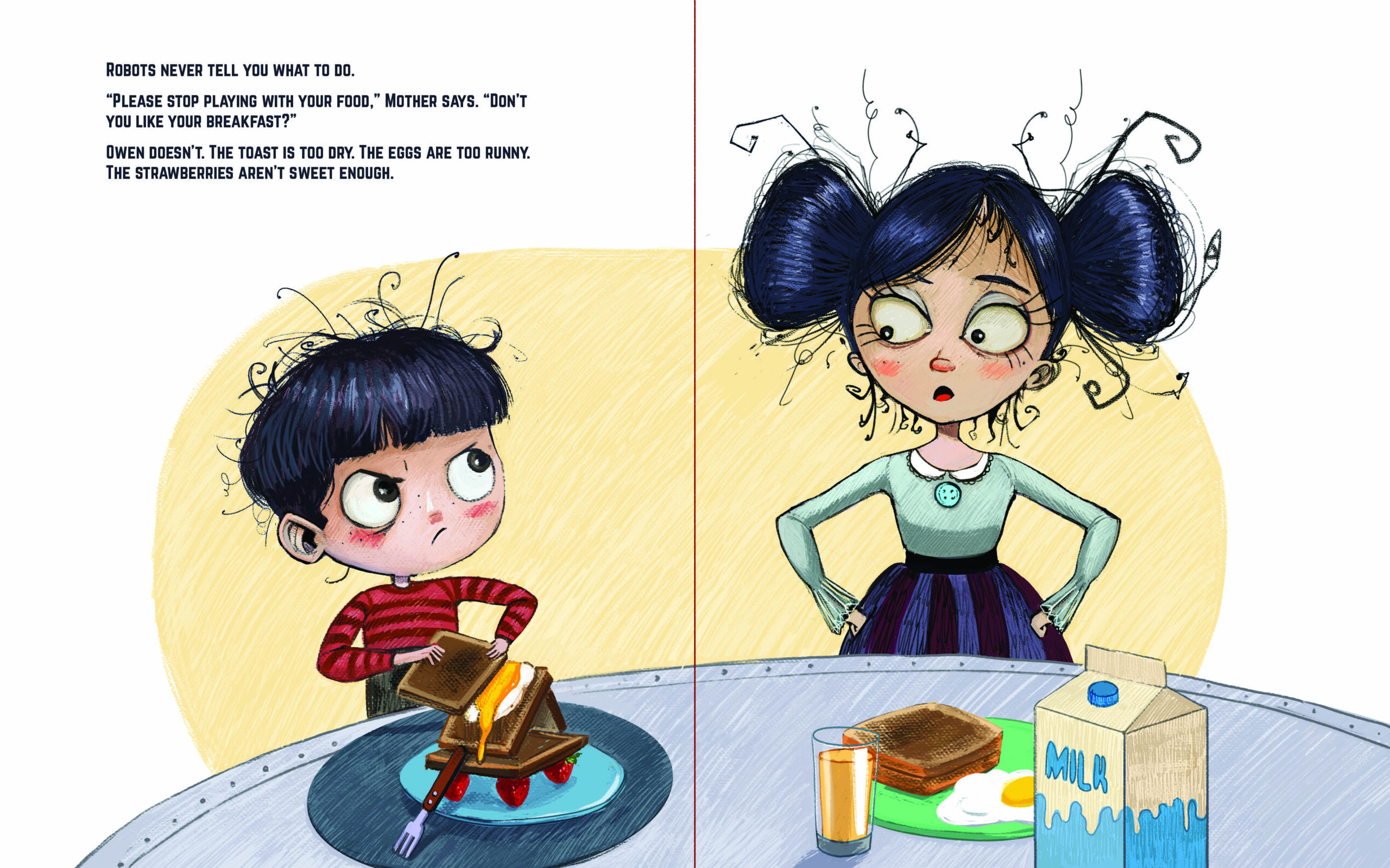 When Owen wins a build-a-robot kit, he assembles what he hopes will be the perfect mother. Robots don’t make you eat your breakfast. Robots don’t make you clean up your toys. And robots definitely don’t make you go to bed. But there are some things that make mothers unique, and Owen soon realizes that a robot mother can never replace the real thing. With a Tim Burton-esque art style, a die-cut and embossed cover, and a gentle moral, Robots Don’t Make You Go to Bed is perfect for aspiring inventors and anyone with a mother.