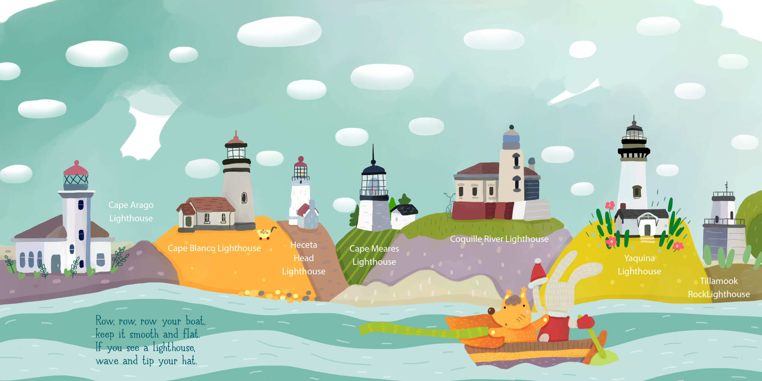 Row, row, row your boat . . . in Oregon! The sights and scenery of Oregon spring to life in this adorable twist on the favorite children’s song. Each die-cut page of the layered board book reveals an imaginary boat sailing past Mount Hood, the Tillamook factory, Sea Lion Caves, coastal lighthouses, and more! A delightful children’s introduction to the iconic places of Oregon, and when you’re done with your journey? Row, row, row your boat back around the bend. If you love Oregon, sing the song again!