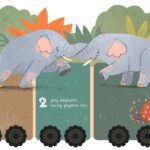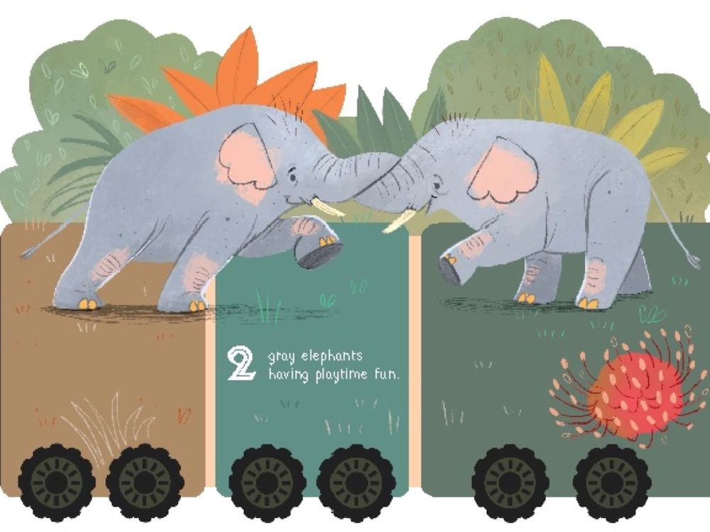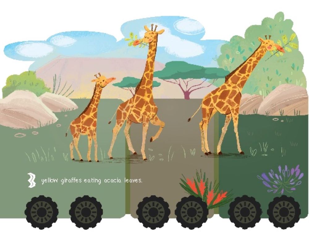 A book, toy, and decoration all in one, this 56" foldable train tours the wild animals of Africa from A to Z