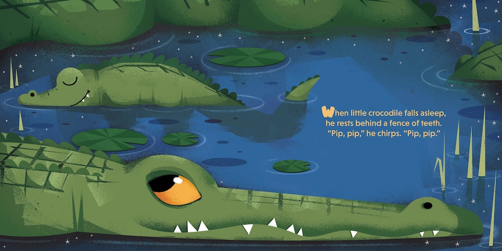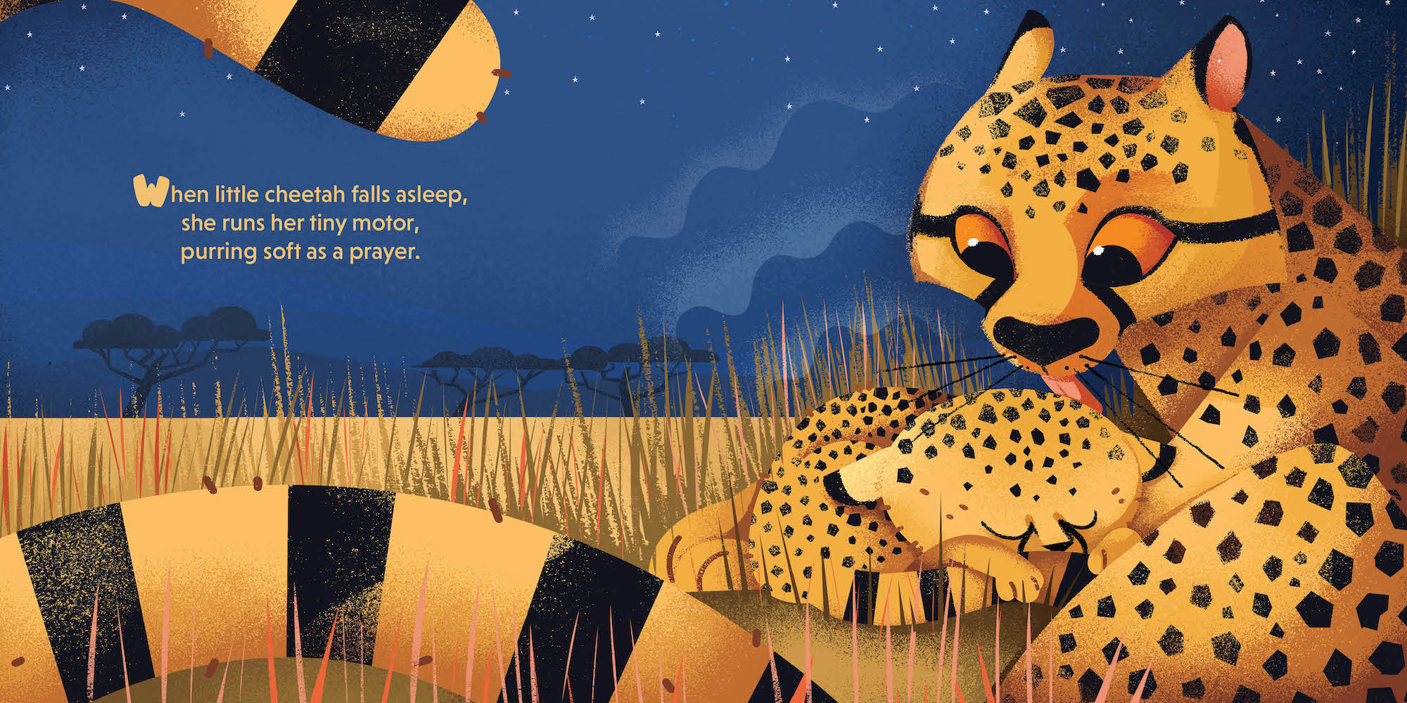It’s nighttime on the savanna, and ten little animals are drifting off to sleep. Little cheetah runs her tiny motor, and little crocodile rests behind a fence of teeth.