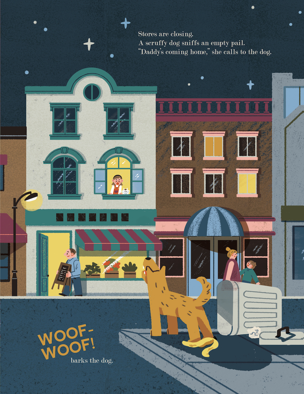 The sights and sounds of the city come alive in a magical way as Lucy waits eagerly for her father to return from work. Watching out the window, Lucy’s view of dogs, bakers, and buses is juxtaposed with her father’s journey through crowds, trains, and finally home to tuck her in. Detailed illustrations contrast a child’s fantastical view of the world with reality, all leading up to a cozy finish that will make this a perfect bedtime book for city children everywhere.