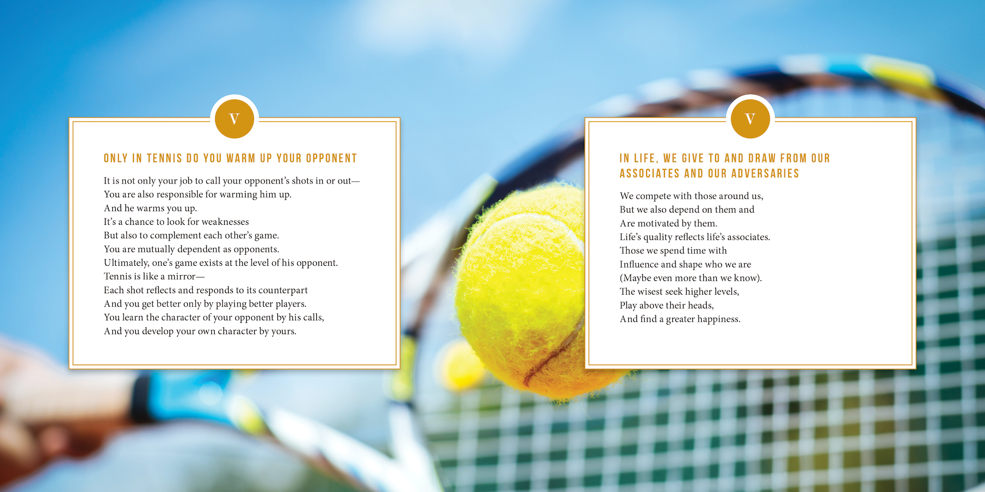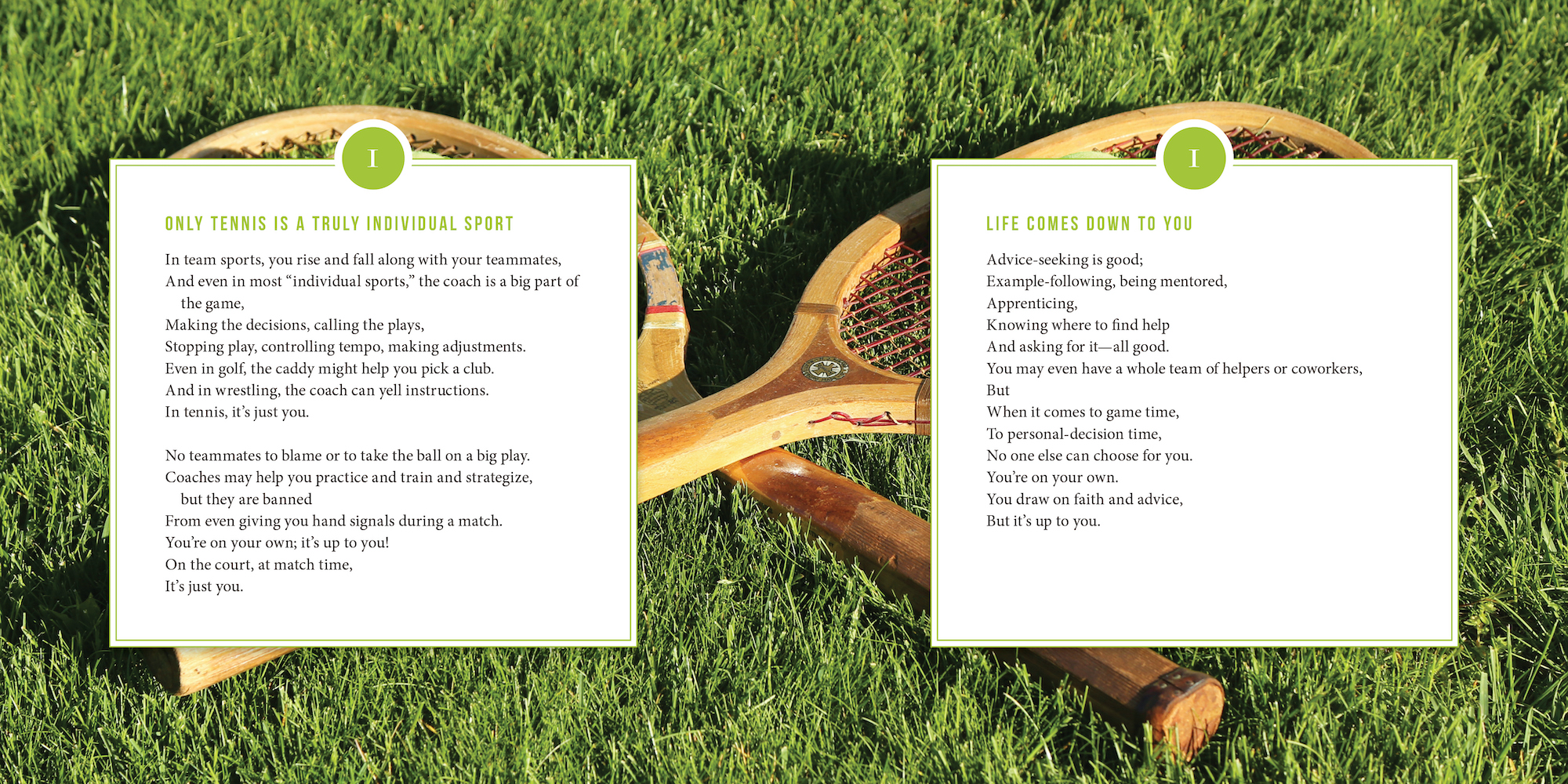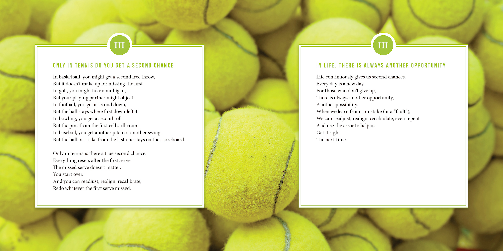 Games are made up of structured but unpredictable situations, with rules and variables and competition, and they produce wins and losses. This description fits life at least as well as it fits tennis. Even the terminology of tennis matches many of the most pivotal and defining words of life: love, faults, serve, receive, winners, challenges, holds.