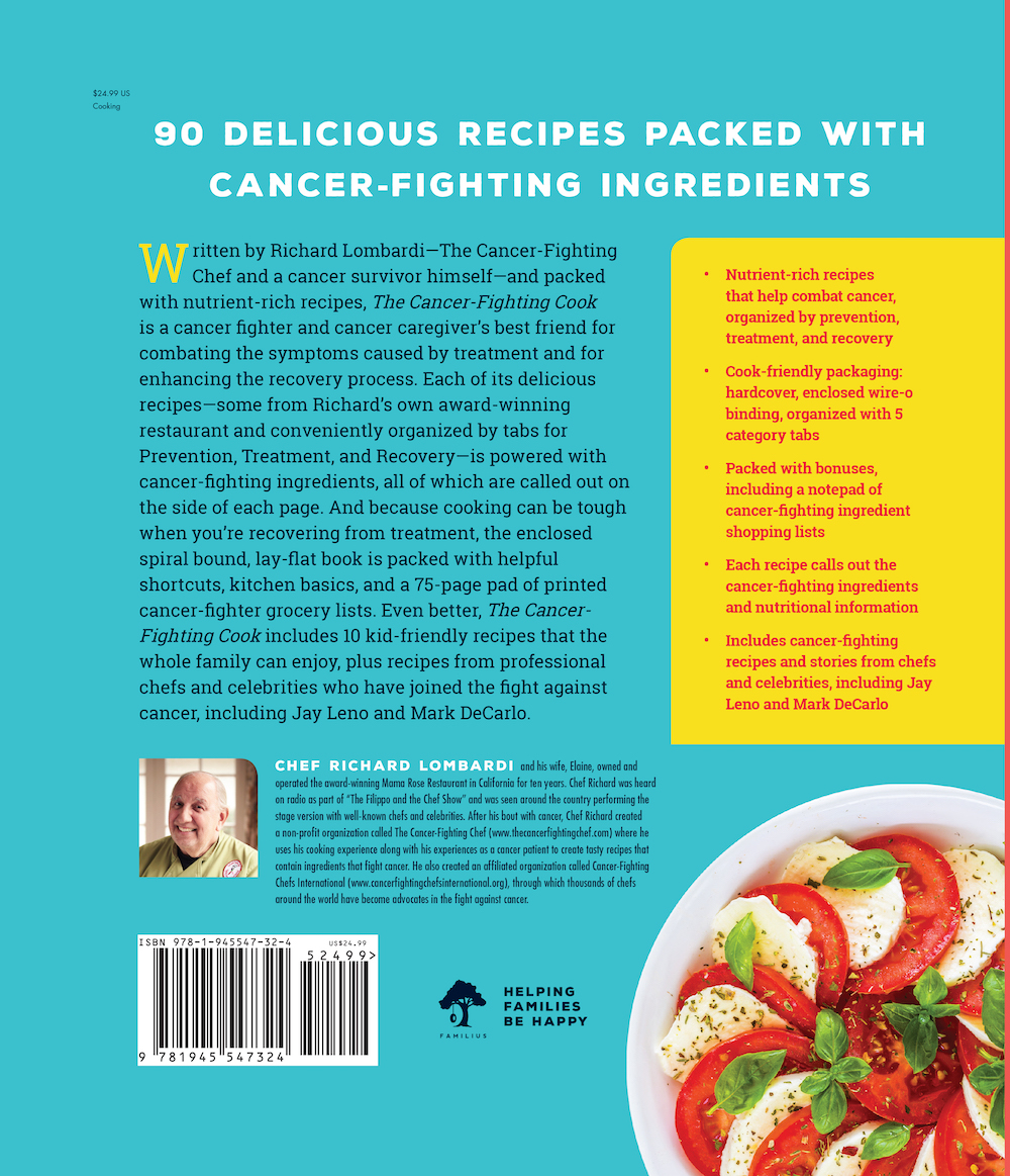The Cancer-Fighting Cook is a cancer fighter and cancer caregiver’s best friend for combating the symptoms caused by treatment and for enhancing the recovery process. Written by Richard Lombardi (The Cancer Fighting Chef and a cancer survivor himself) and packed with nutrient-rich recipes—some from Richard’s own award-winning restaurant and conveniently organized by tabs for Treatment, Recovery, and Prevention. Each recipe is powered with cancer-fighting ingredients, which are called out on the side of each page. And because cooking can be tough when you’re recovering from treatment, the enclosed spiral bound, lay-flat book is packed with helpful shortcuts, kitchen basics, a removable quick-reference list, and a 75-page pad of printed cancer-fighter grocery lists. Even better, The Cancer Fighting Cook includes 10 kid-friendly recipes that the whole family can enjoy, plus recipes from professional chefs and celebrities that have joined the fight against cancer, including Jay Leno and Mark DeCarlo.