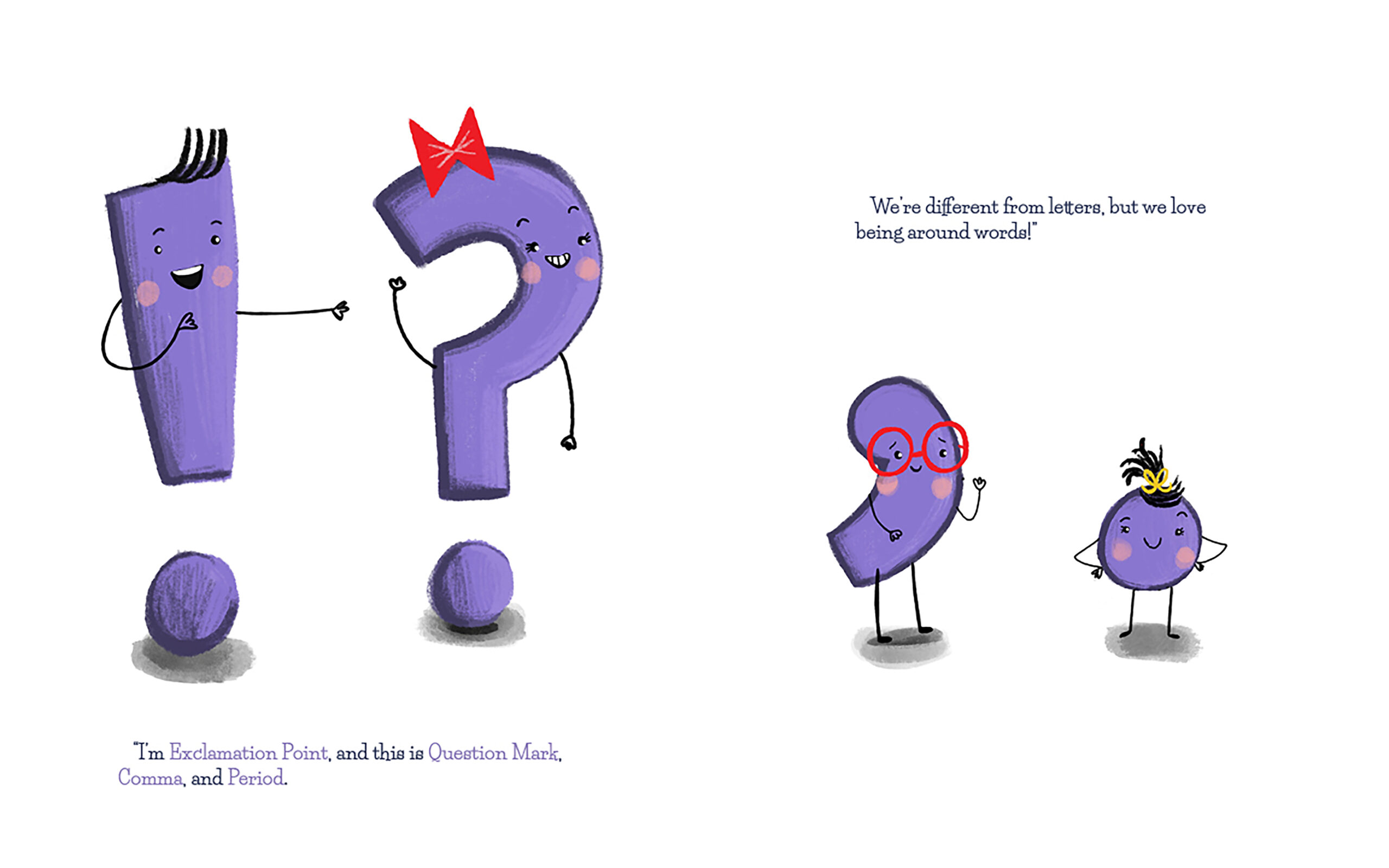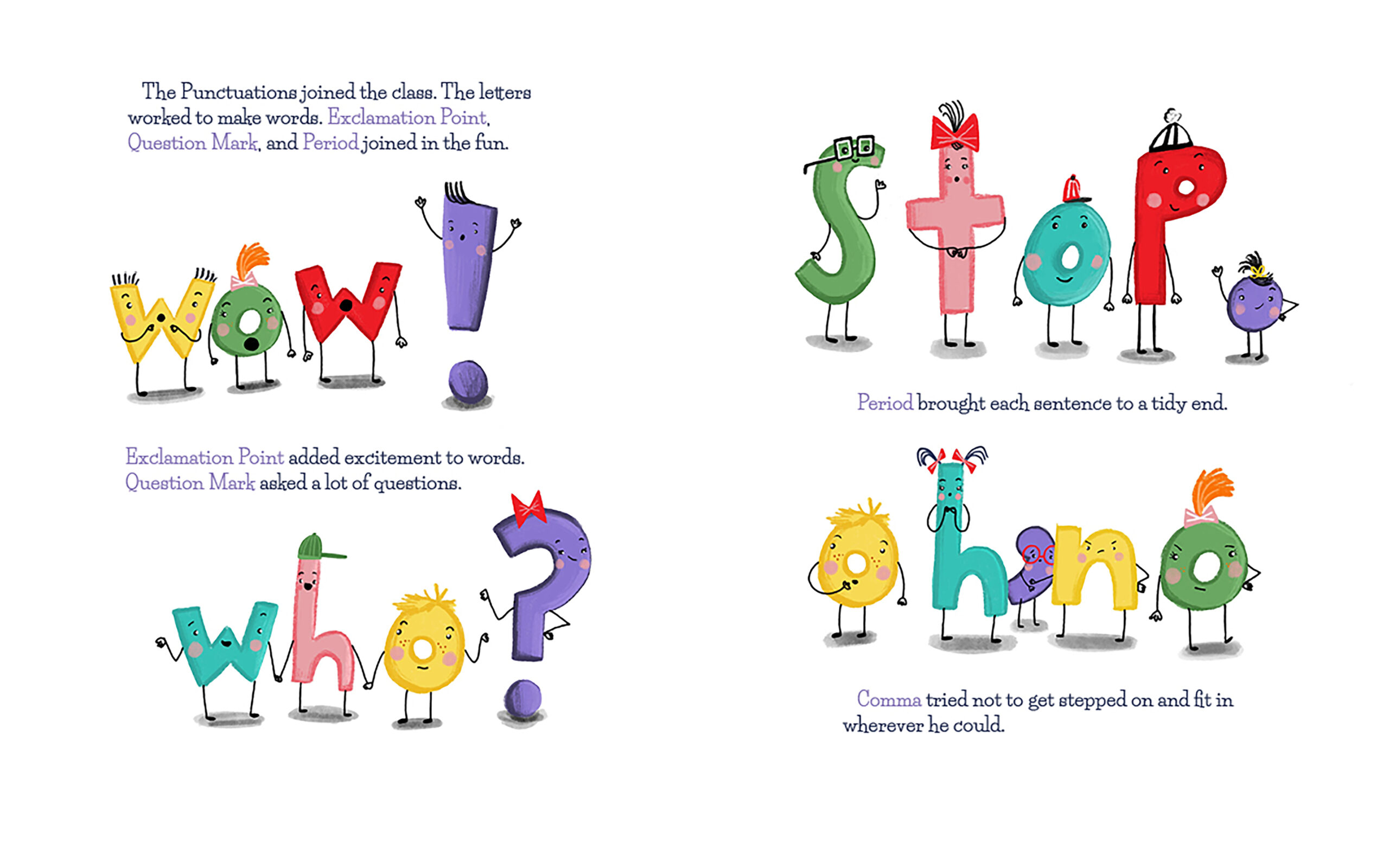 When Exclamation Point, Question Mark, Period, and Comma arrive at school, the letters are buzzing with excitement. Words like Wow! and Why? come to life, but Comma feels unsure of his place. Is he really important?