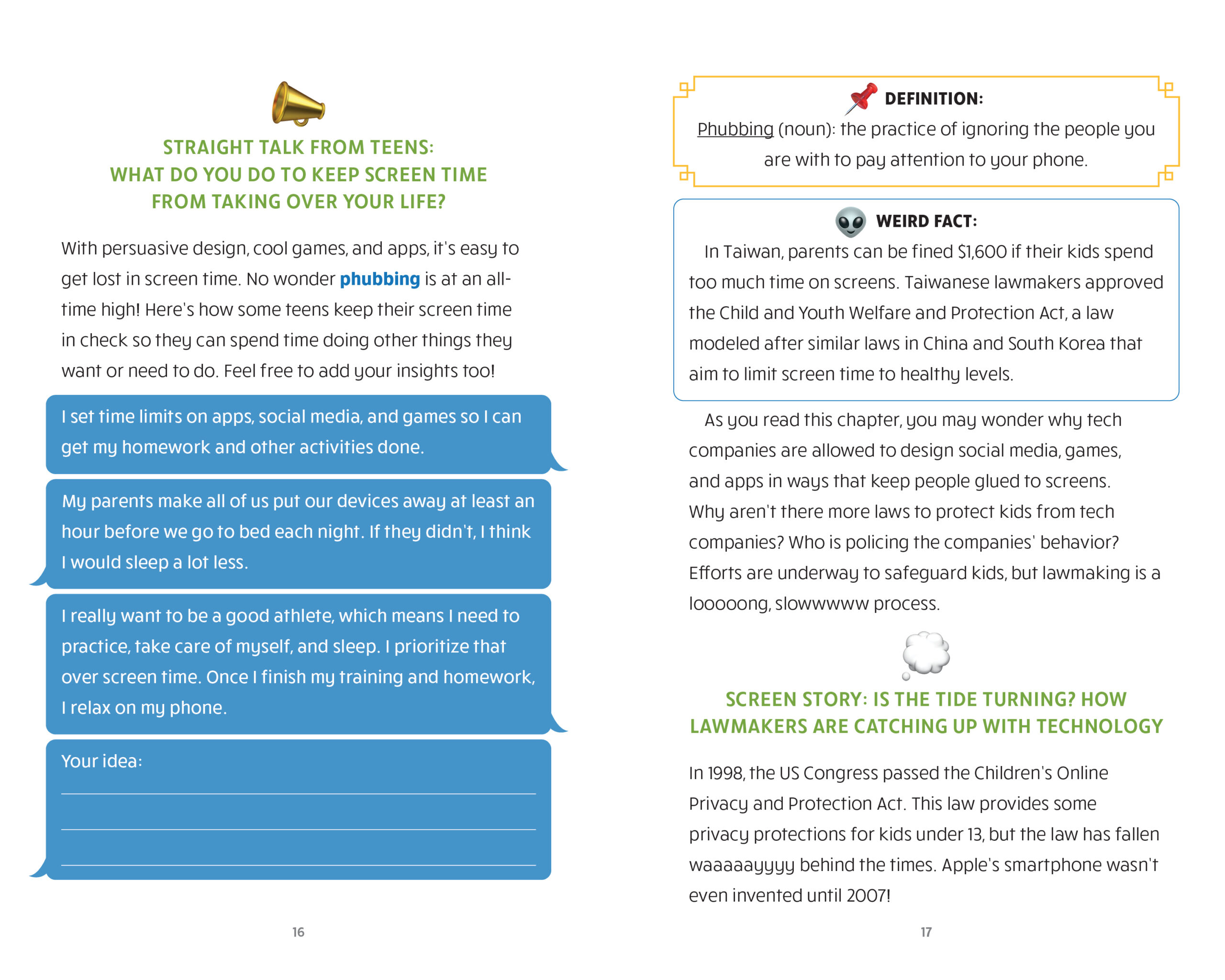 Packed with research-based explanations, techy tidbits, and real stories from hundreds of teens and preteens, this phone book (the fun kind) will be your guide on the path of light, teaching you healthy phone habits and ways to stay safe online.