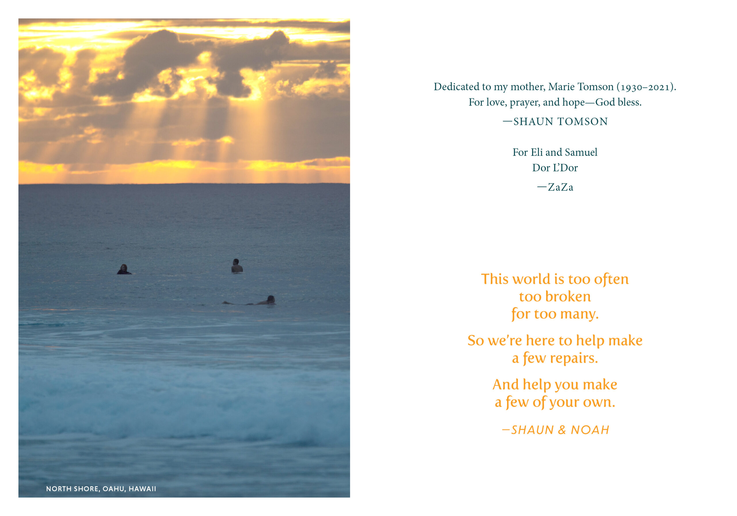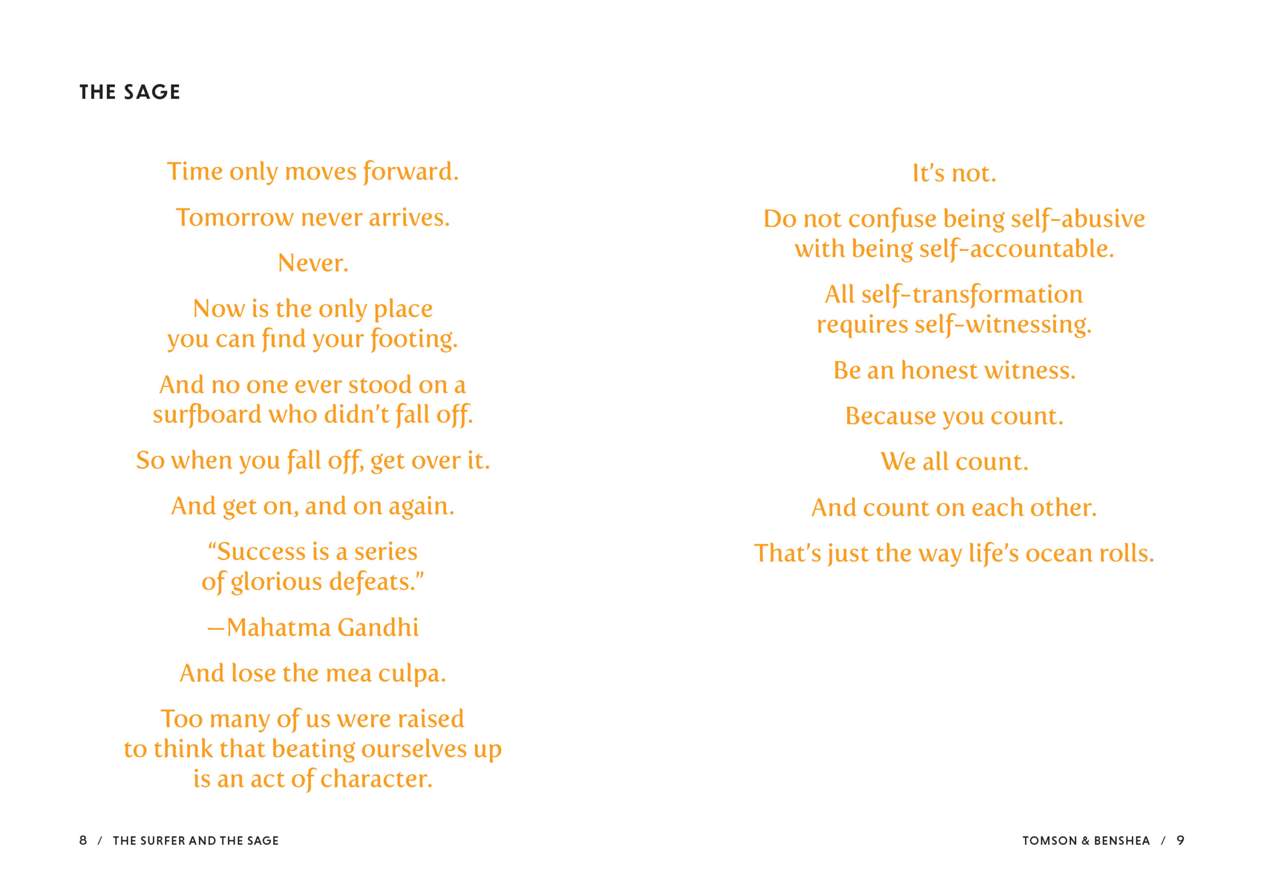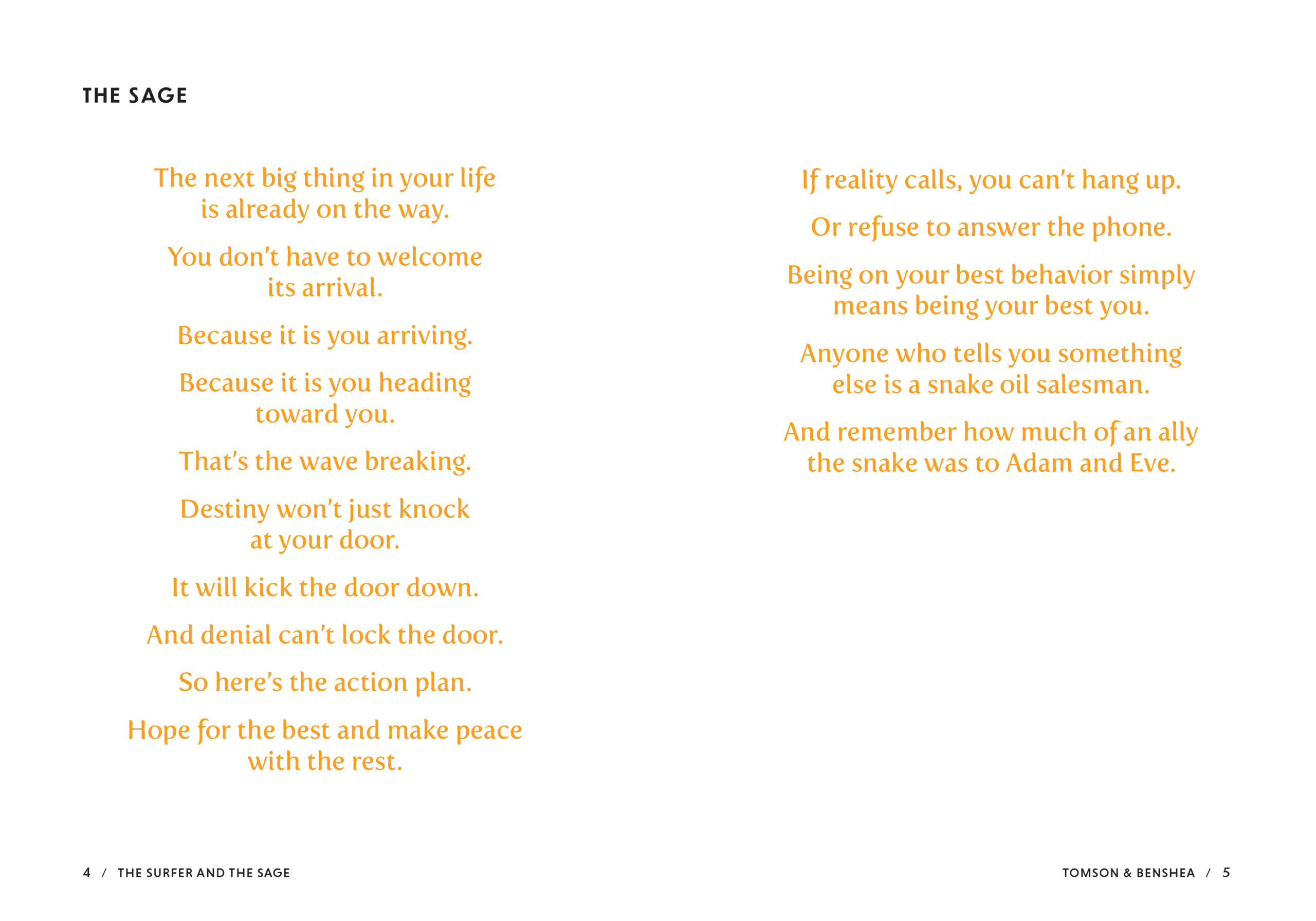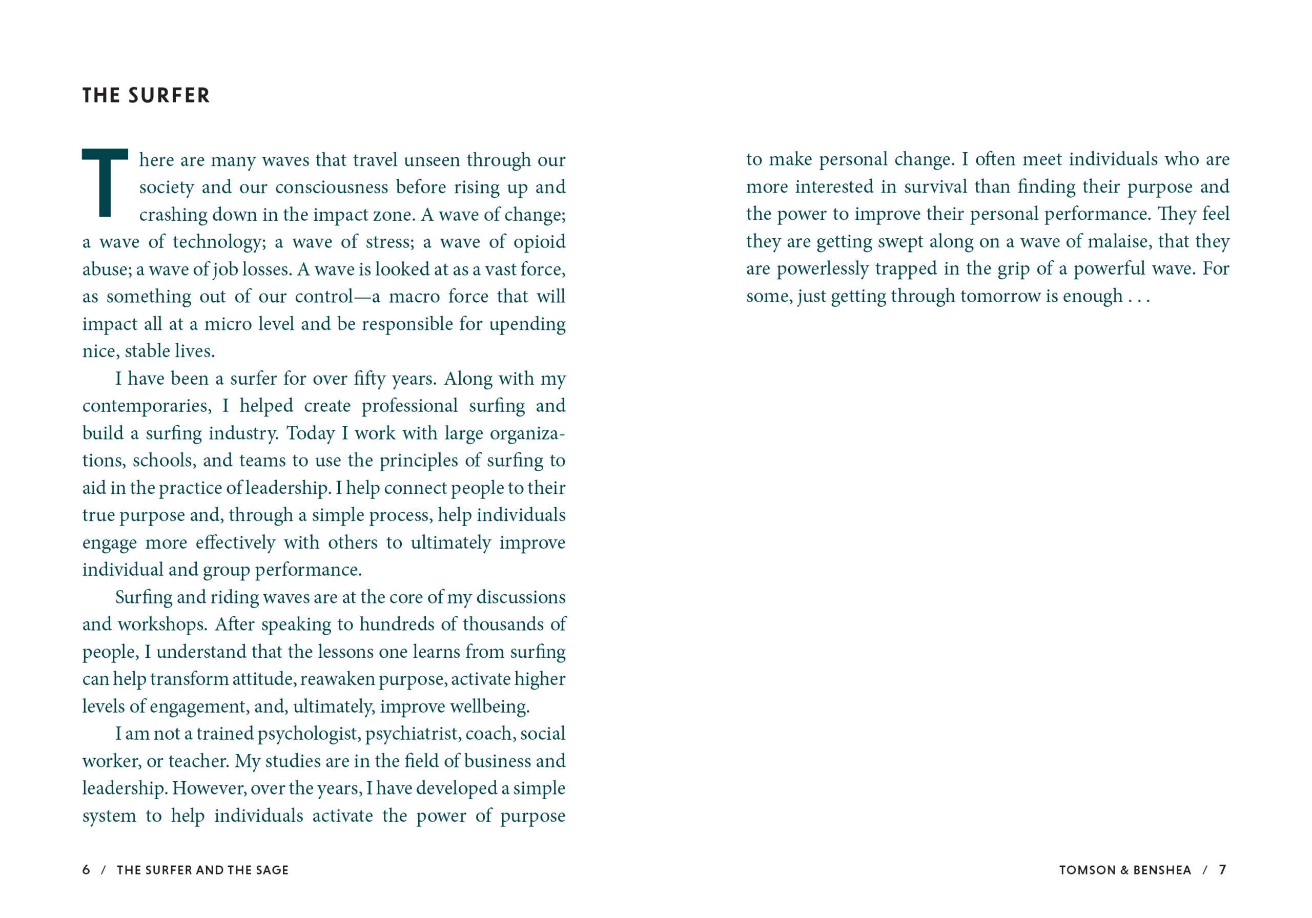 After losing his son, Tomson walked the bitter road of loss and crossed from darkness into the light. The Surfer and the Sage addresses the eighteen relentless, breaking waves of life, from loss and aging to relationships and depression, and guides you to transformation. It is not a list of rules to follow that guarantee success, health, or wealth, but rather a collection of advice from two guides who have traveled far and wide and suffered deeply, but still look forward to tomorrow with faith and hope.