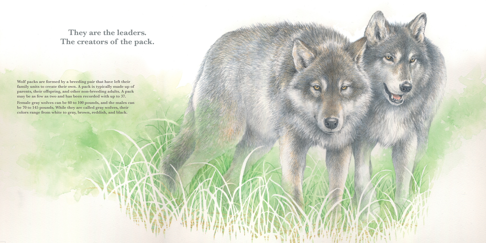 A wolf’s piercing howl can carry up to 10 miles, raising goosebumps on even the most intrepid camper’s skin. But the gray wolf is far from a simple predator. An incredible combination of teamwork and instinct has helped wolf packs survive, despite being endangered in most of North America. With a mother wolf and father wolf leading the pack–their family–together, the cubs grow and learn the skills they need to start their own pack someday. With stunning, lifelike illustrations and facts on each page for grownups or older children who want a deeper dive, this beautiful picture book is a monument to these majestic packs.