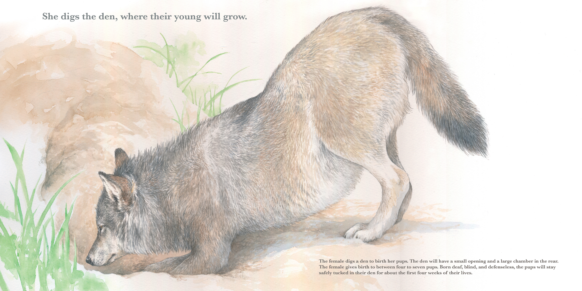 She digs the den, where their young will grow.