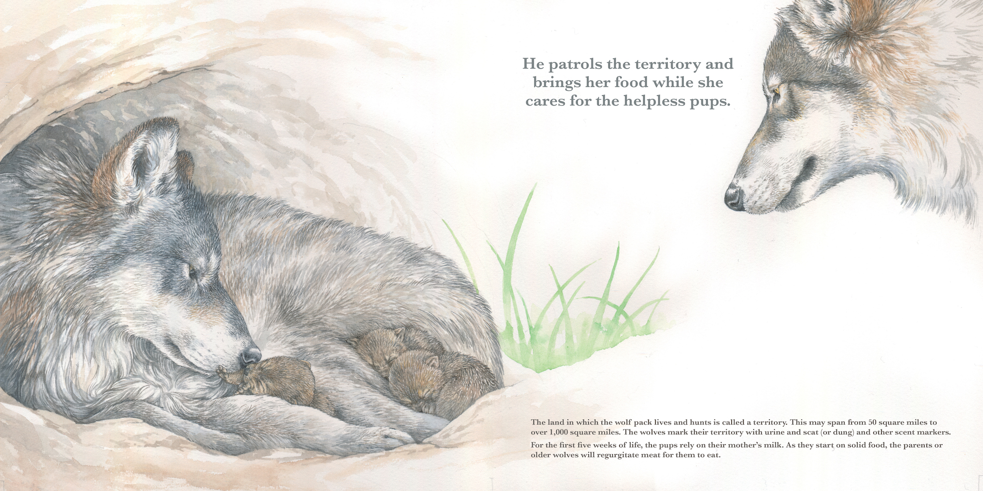 He patrols the territory and brings her food while she cares for the helpless pups.