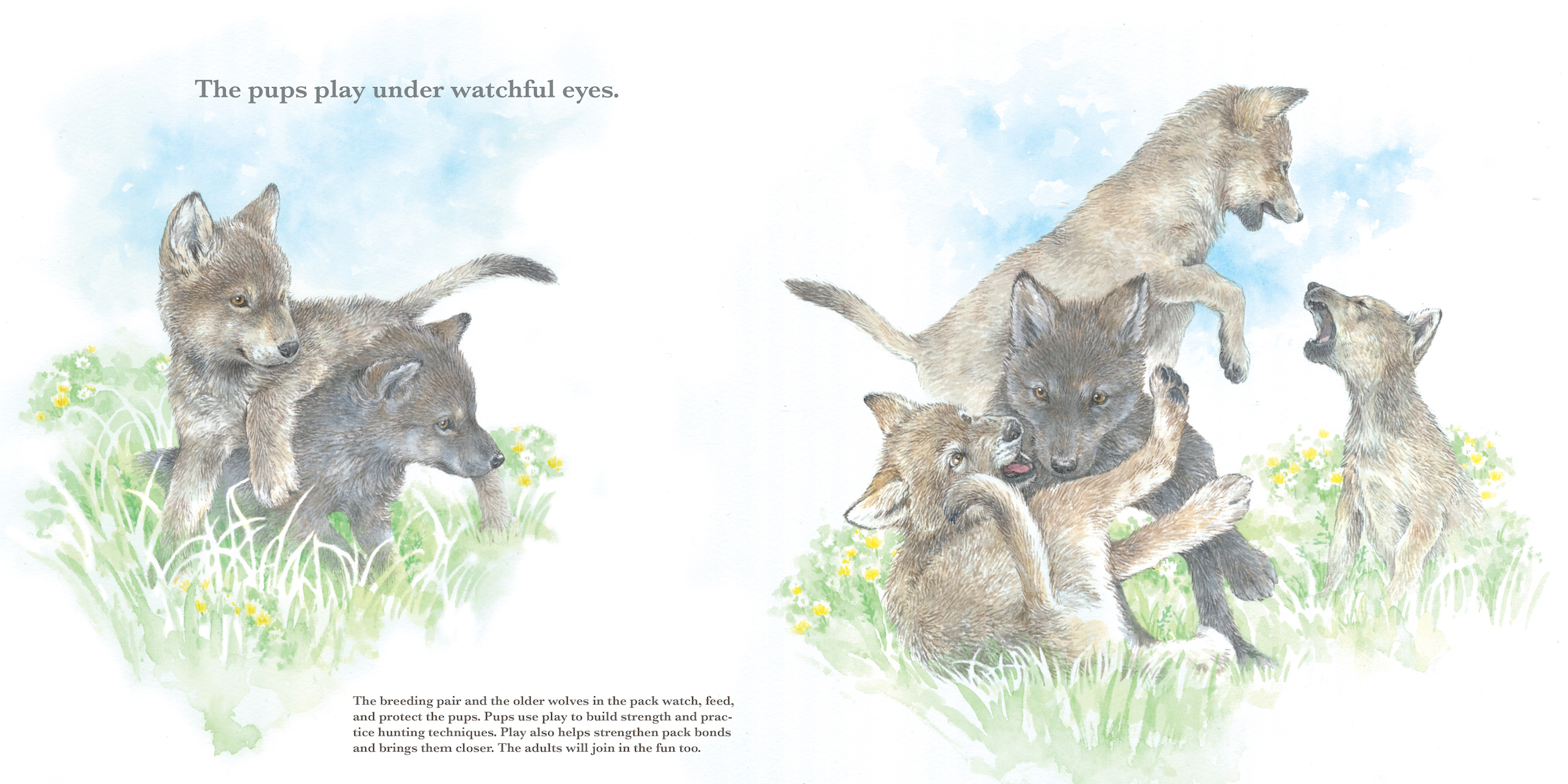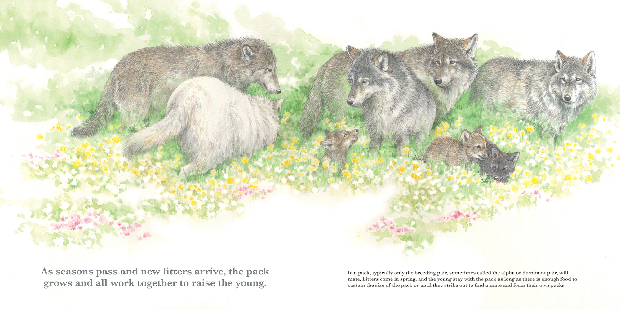 As seasons pass, and new litters arrive, the pack grows and all work together to raise the young.