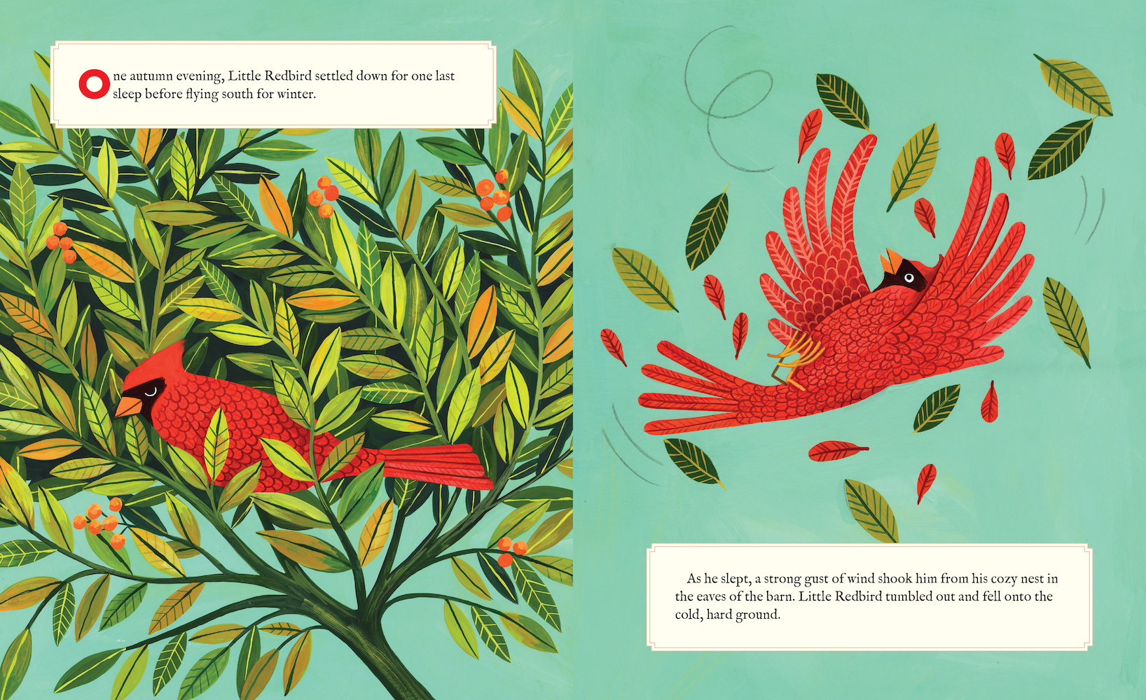 One autumn evening, Little Redbird settled down for one last sleep before flying south for winter. As he slept, a strong gust of wind shook him from his cozy nest . . .