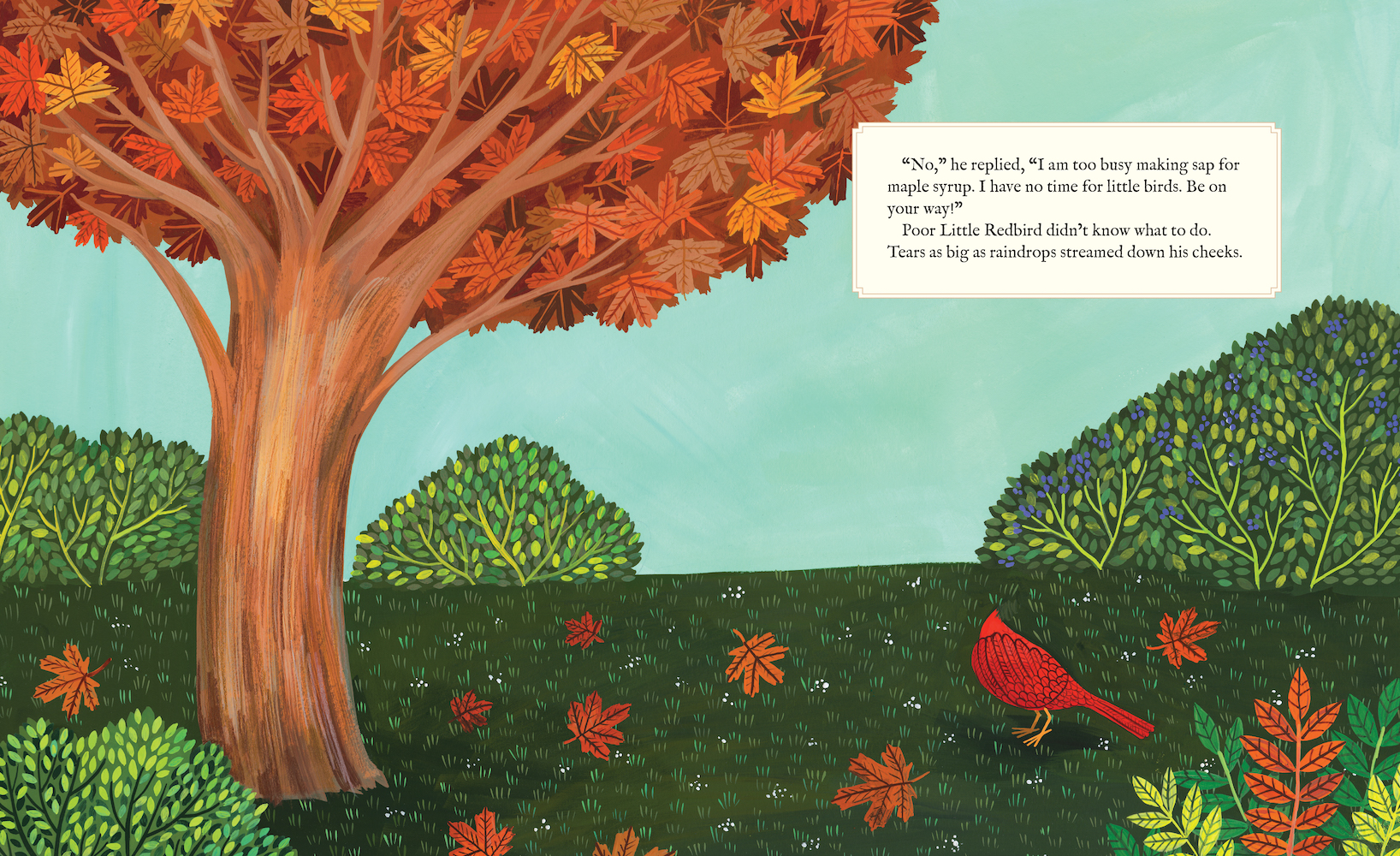 . . . Little Redbird hurts his wing and misses his chance to fly south for the winter. As he searches for a new home amongst the trees, he begins to realize that not all trees are fit for the winter cold. As more and more trees refuse him shelter, too preoccupied with their preparations for the frost, Little Redbird fears the worst. That is, until he comes across a friendly bunch of evergreens.
