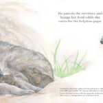 He patrols the territory and brings her food while she cares for the helpless pups.